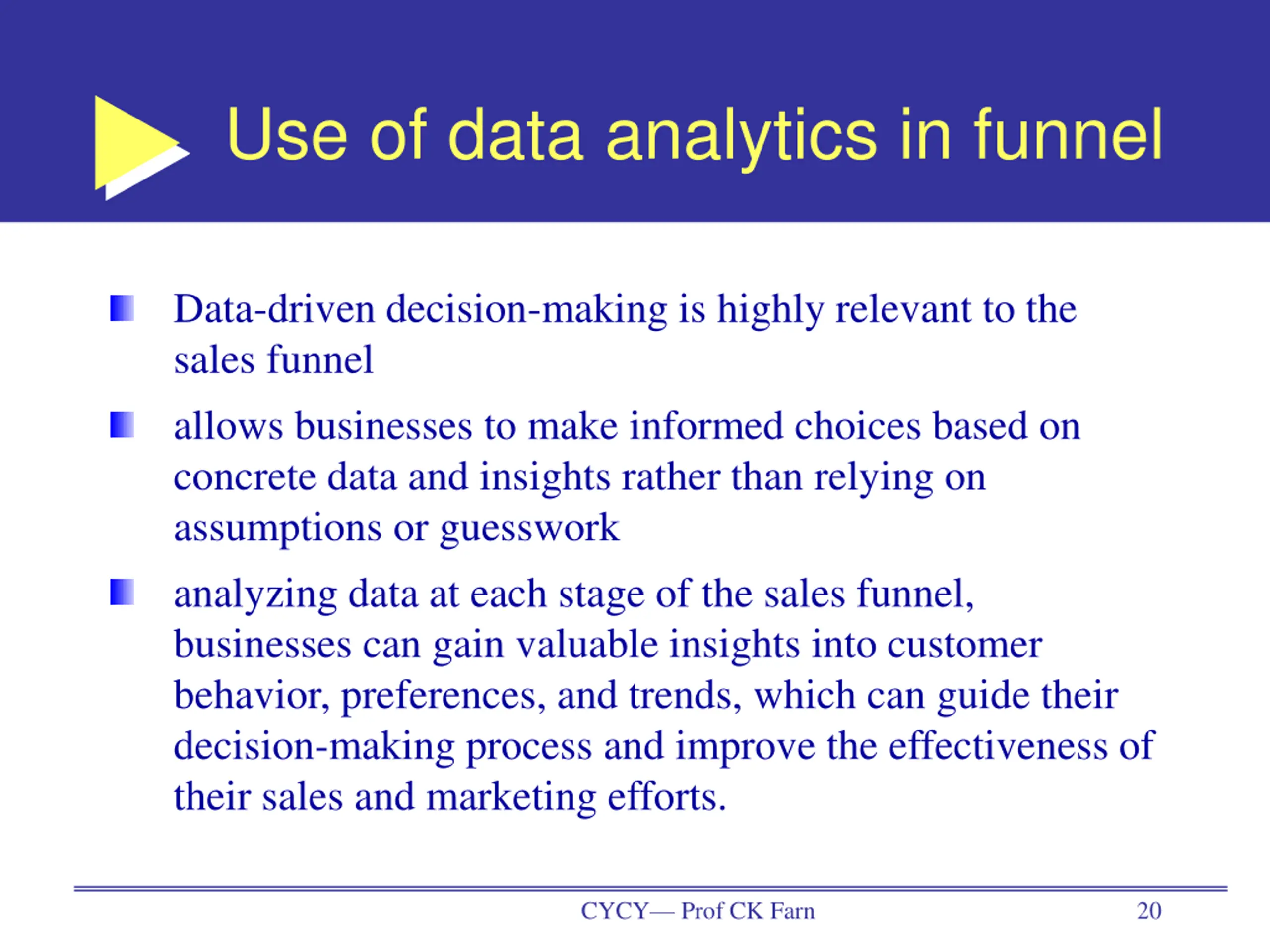 Use of data analytics in funnel Data-driven decision-making is highly relevant to the sales funnel allows businesses to make informed choices based on concrete data and insights rather than relying on assumptions or guesswork analyzing data at each stage of the sales funnel, businesses can gain valuable insights into customer behavior, preferences, and trends, which can guide their decision-making process and improve the effectiveness of their sales and marketing efforts. CYCY Prof CK Farn 20