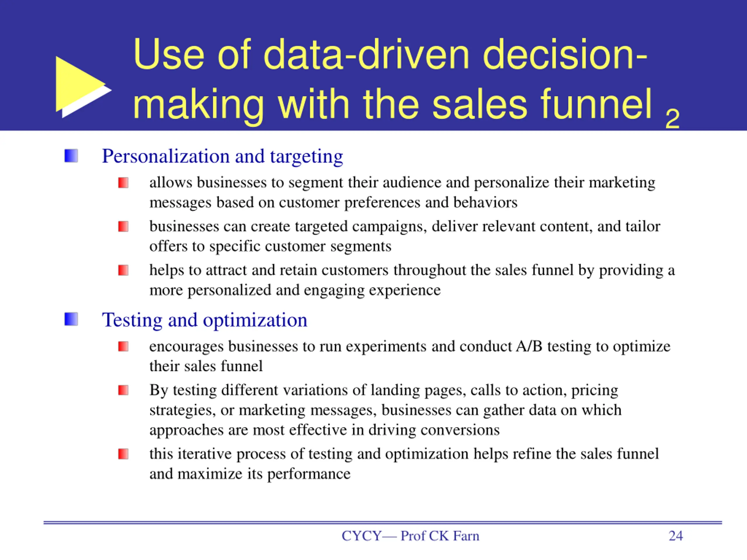 Use of data-driven decision- making with the sales funnel 2 Personalization and targeting allows businesses to segment their audience and personalize their marketing messages based on customer preferences and behaviors businesses can create targeted campaigns, deliver relevant content, and tailor offers to specific customer segments helps to attract and retain customers throughout the sales funnel by providing a more personalized and engaging experience Testing and optimization encourages businesses to run experiments and conduct A/B testing to optimize their sales funnel By testing different variations of landing pages, calls to action, pricing strategies, or marketing messages, businesses can gather data on which approaches are most effective in driving conversions this iterative process of testing and optimization helps refine the sales funnel and maximize its performance CYCY Prof CK Farn 24