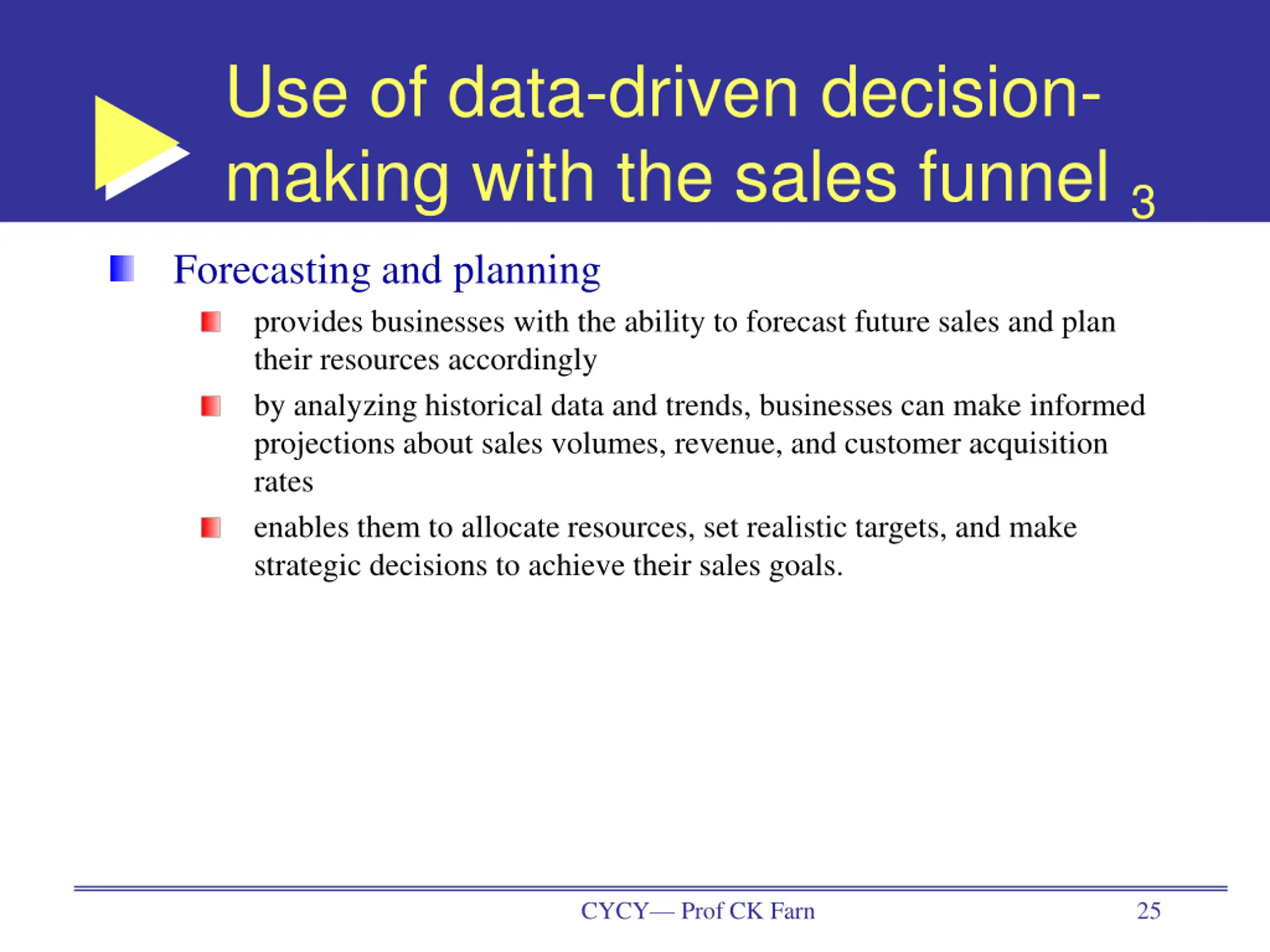 Use of data-driven decision- making with the sales funnel 3 Forecasting and planning provides businesses with the ability to forecast future sales and plan their resources accordingly by analyzing historical data and trends, businesses can make informed projections about sales volumes, revenue, and customer acquisition rates enables them to allocate resources, set realistic targets, and make strategic decisions to achieve their sales goals. CYCY Prof CK Farn 25
