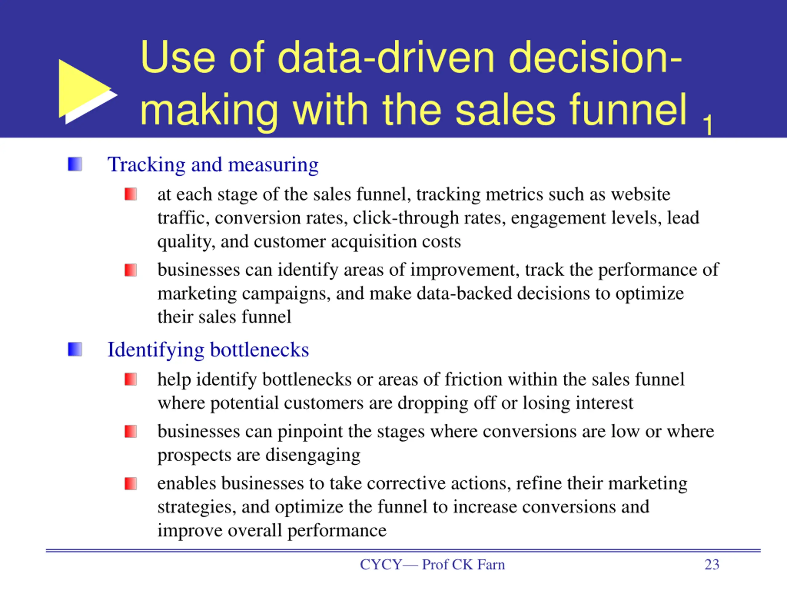 Use of data-driven decision- making with the sales funnel 1 Tracking and measuring at each stage of the sales funnel, tracking metrics such as website traffic, conversion rates, click-through rates, engagement levels, lead quality, and customer acquisition costs businesses can identify areas of improvement, track the performance of marketing campaigns, and make data-backed decisions to optimize their sales funnel Identifying bottlenecks help identify bottlenecks or areas of friction within the sales funnel where potential customers are dropping off or losing interest businesses can pinpoint the stages where conversions are low or where prospects are disengaging enables businesses to take corrective actions, refine their marketing strategies, and optimize the funnel to increase conversions and improve overall performance CYCY Prof CK Farn 23