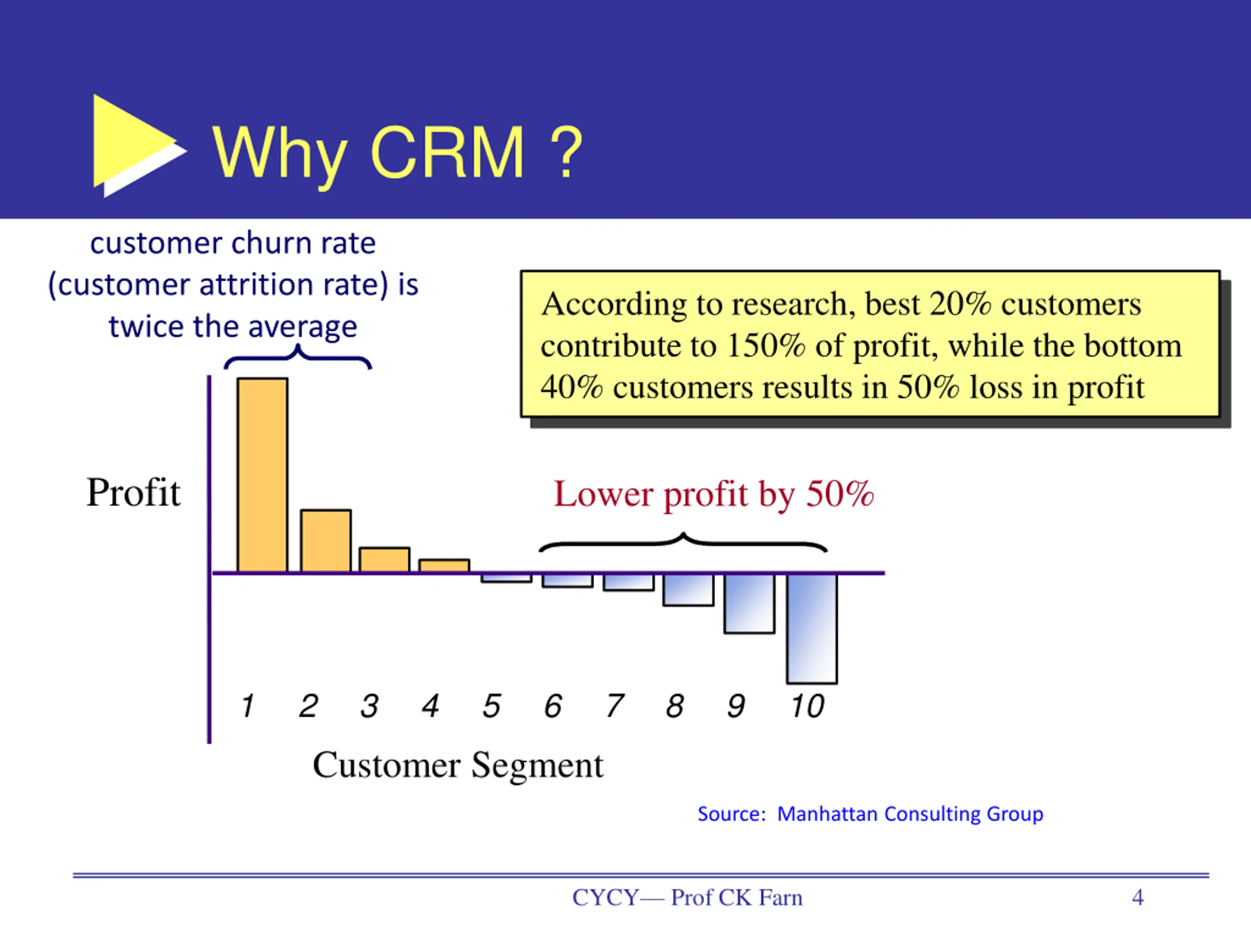 Why CRM ? customer churn rate (customer attrition rate) is twice the average According to research, best 20% customers contribute to 150% of profit, while the bottom 40% customers results in 50% loss in profit Profit Lower profit by 50% 1 2 3 4 5 6 7 8 9 10 Customer Segment Source: Manhattan Consulting Group CYCY Prof CK Farn 4