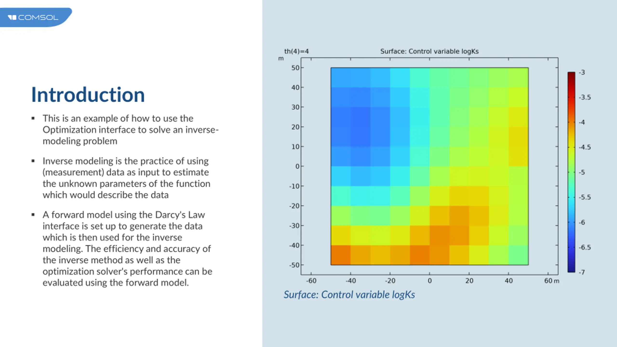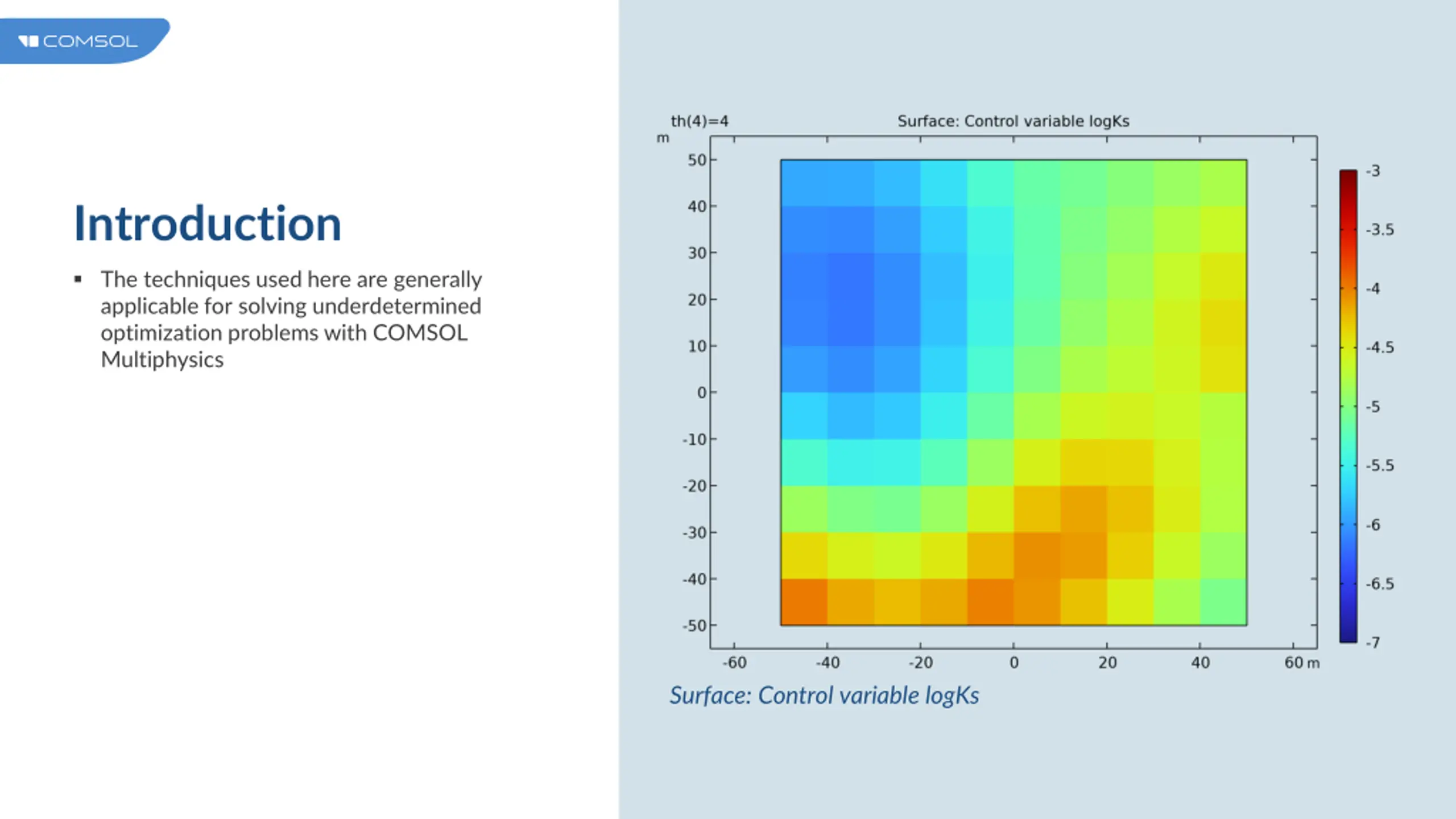 Introduction The techniques used here are generally applicable for solving underdetermined optimization problems with COMSOL Multiphysics Surface: Control variable logKs
