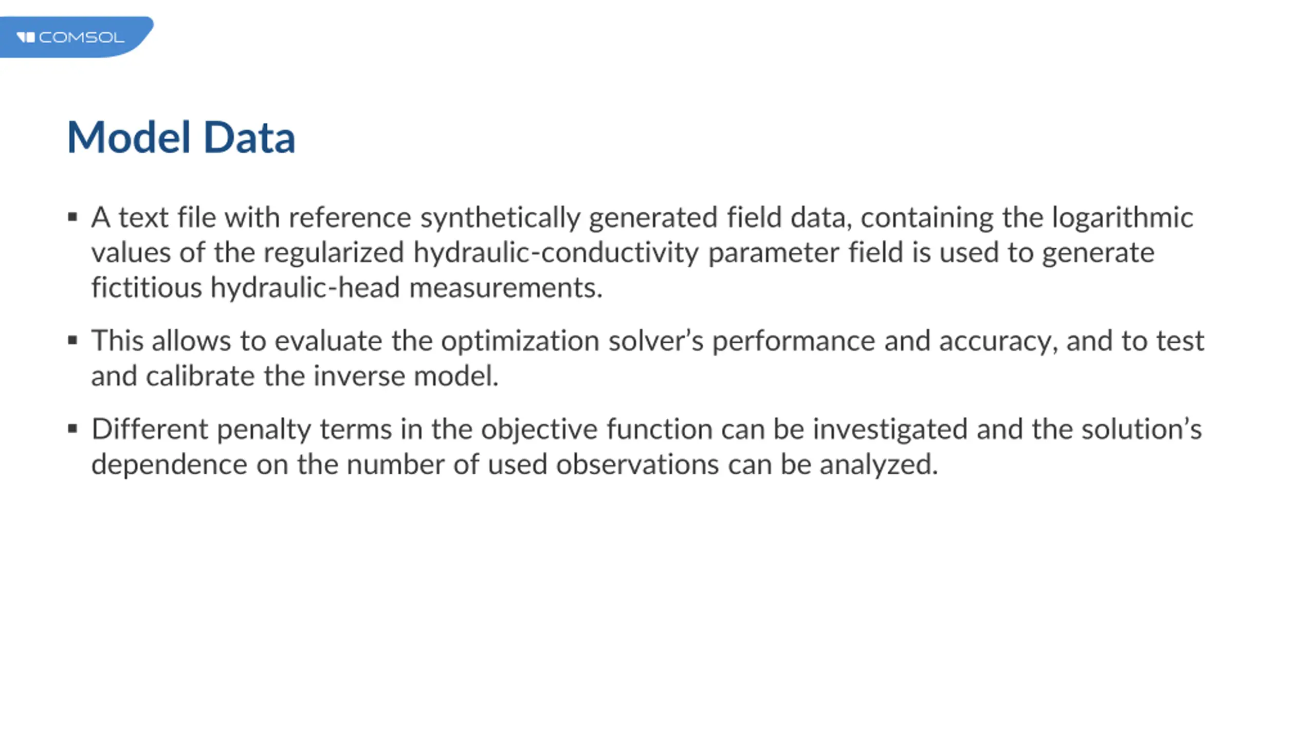 Model Data A text file with reference synthetically generated field data, containing the logarithmic values of the regularized hydraulic-conductivity parameter field is used to generate fictitious hydraulic-head measurements. This allows to evaluate the optimization solver s performance and accuracy, and to test and calibrate the inverse model. Different penalty terms in the objective function can be investigated and the solution s dependence on the number of used observations can be analyzed.