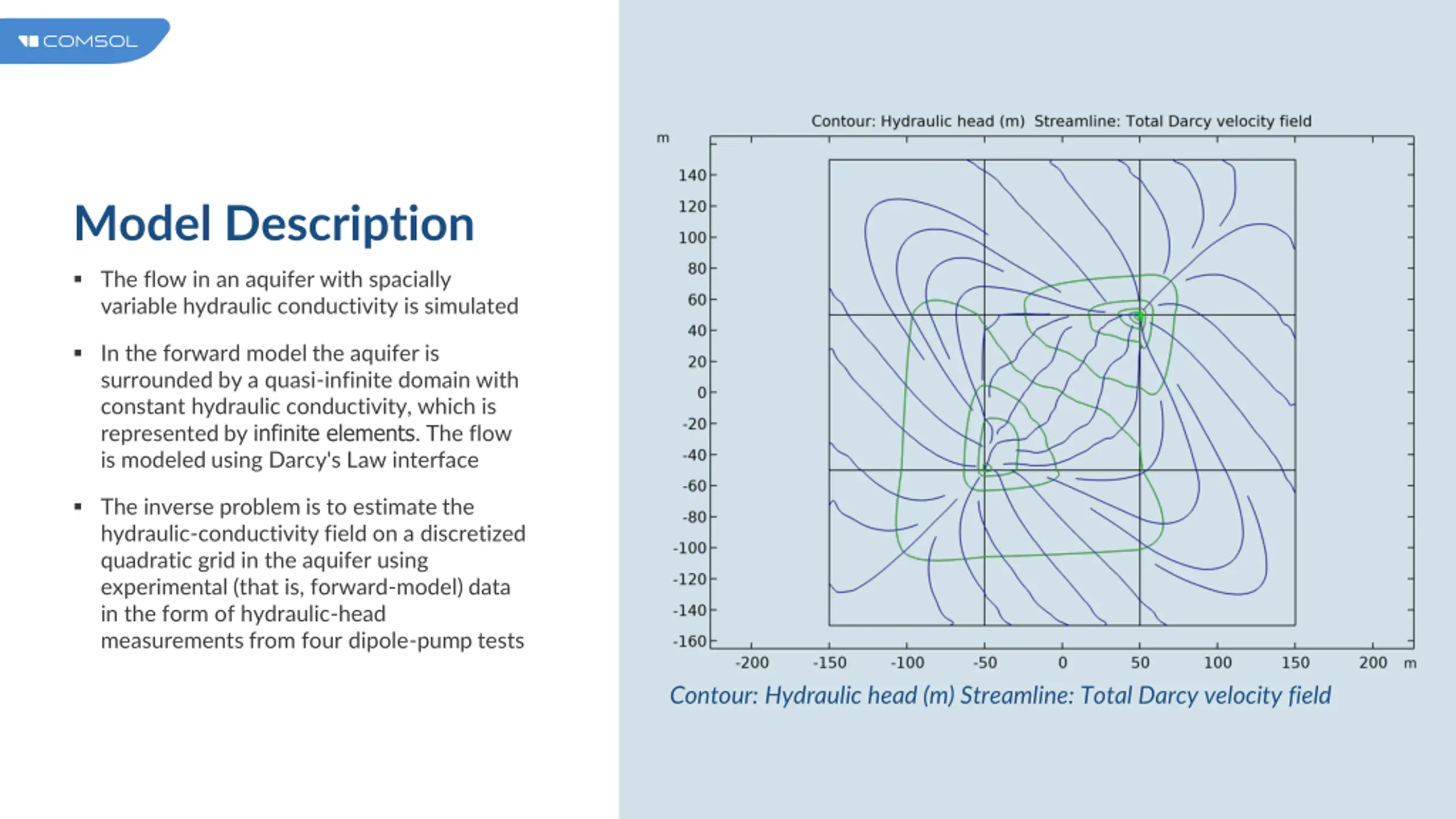Model Description The flow in an aquifer with spacially variable hydraulic conductivity is simulated In the forward model the aquifer is surrounded by a quasi-infinite domain with constant hydraulic conductivity, which is represented by infinite elements. The flow is modeled using Darcy's Law interface The inverse problem is to estimate the hydraulic-conductivity field on a discretized quadratic grid in the aquifer using experimental (that is, forward-model) data in the form of hydraulic-head measurements from four dipole-pump tests Contour: Hydraulic head (m) Streamline: Total Darcy velocity field
