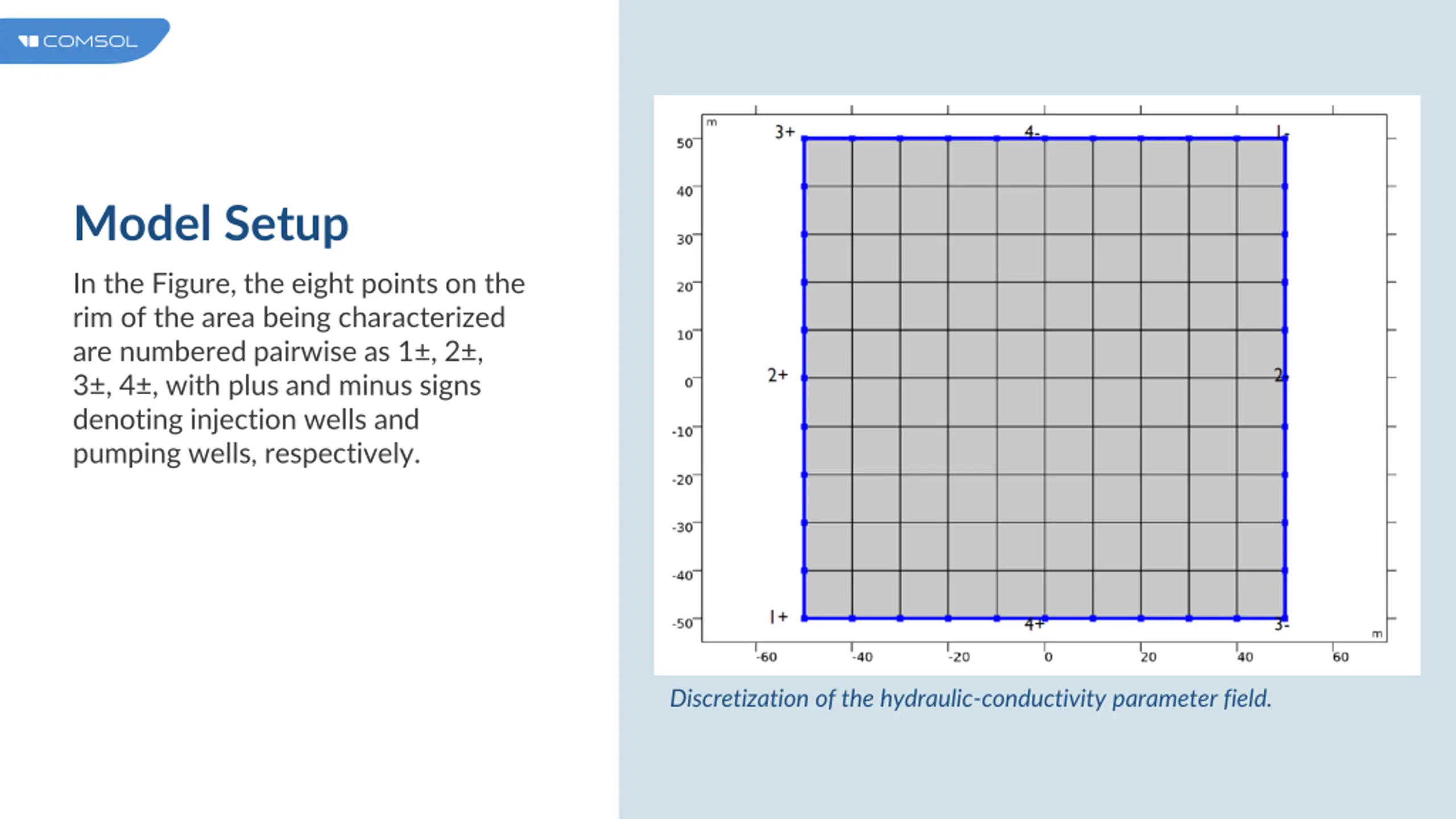 Model Setup In the Figure, the eight points on the rim of the area being characterized are numbered pairwise as 1 , 2 , 3 , 4 , with plus and minus signs denoting injection wells and pumping wells, respectively. Discretization of the hydraulic-conductivity parameter field.