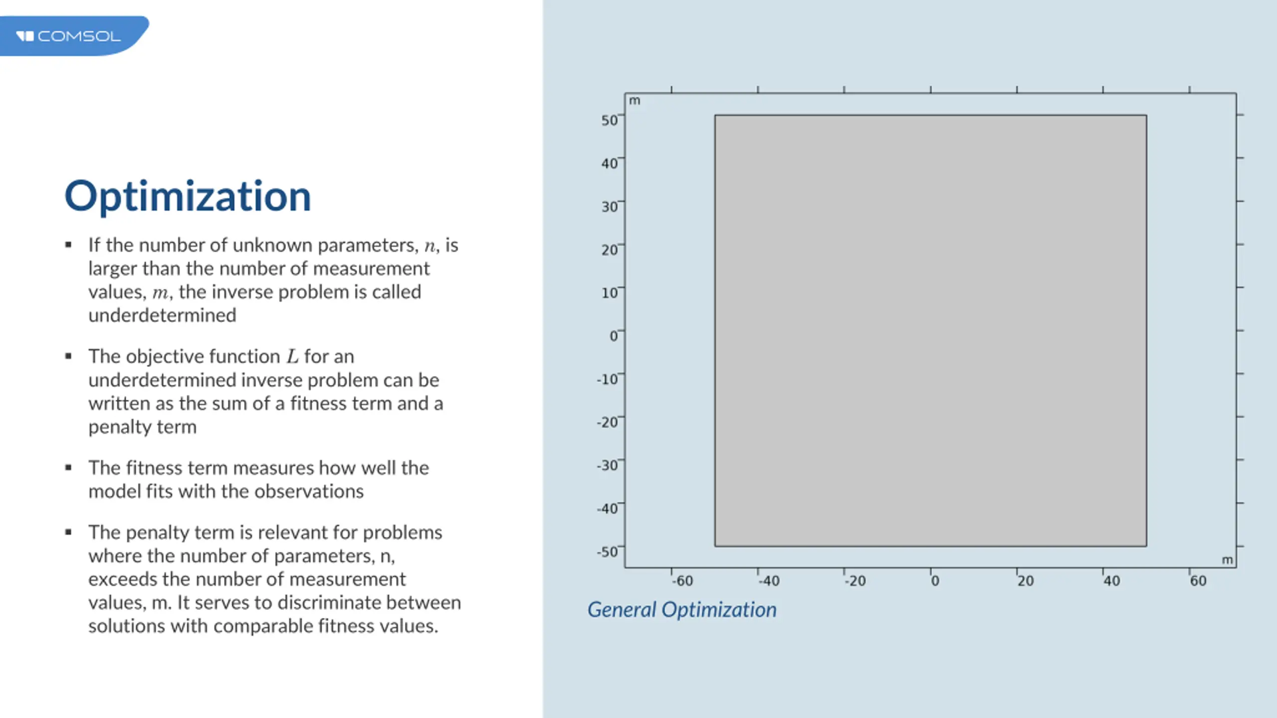 Optimization If the number of unknown parameters, n, is larger than the number of measurement values, m, the inverse problem is called underdetermined The objective function L for an underdetermined inverse problem can be written as the sum of a fitness term and a penalty term The fitness term measures how well the model fits with the observations The penalty term is relevant for problems where the number of parameters, n, exceeds the number of measurement values, m. It serves to discriminate between solutions with comparable fitness values. General Optimization