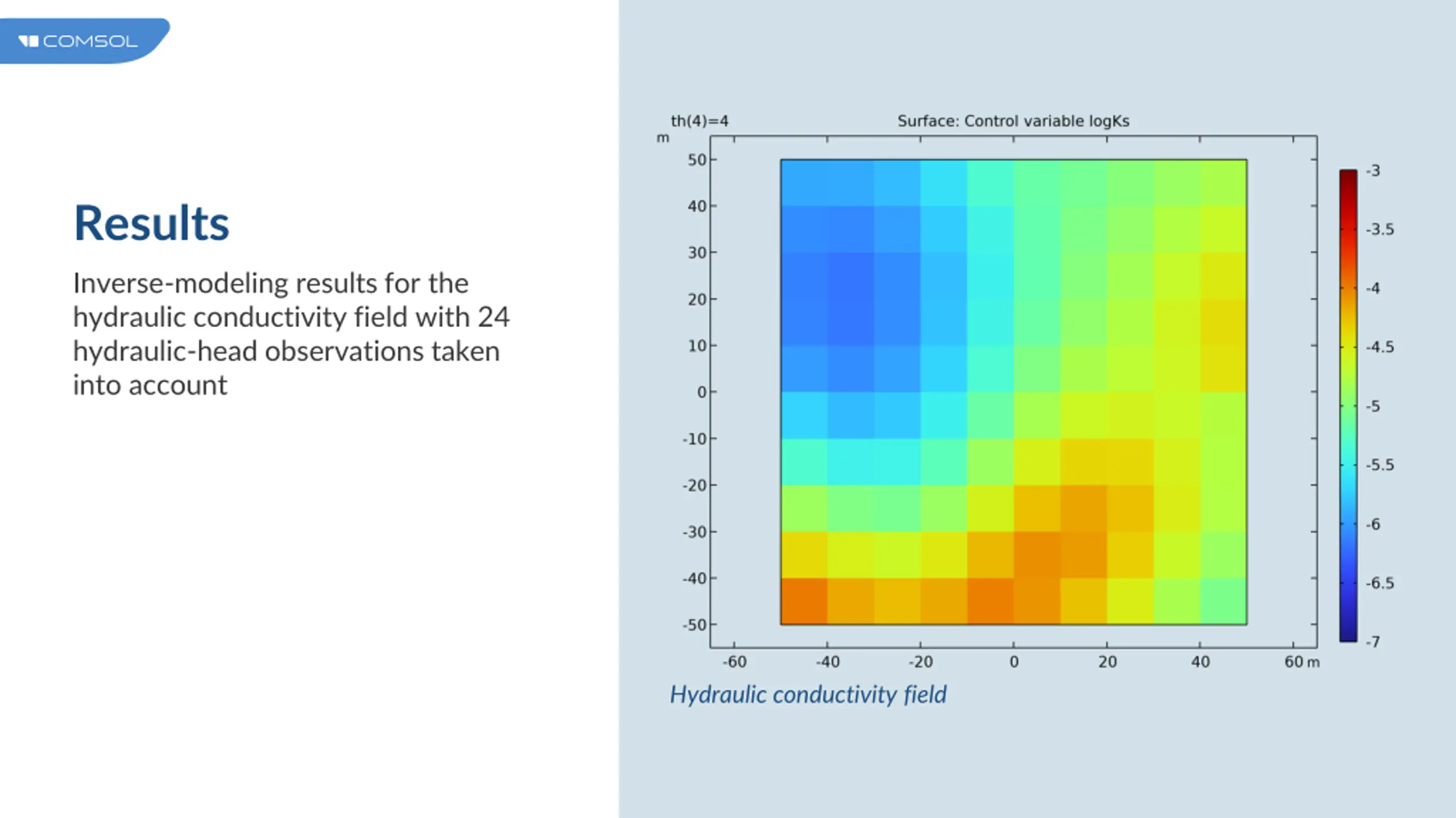 Results Inverse-modeling results for the hydraulic conductivity field with 24 hydraulic-head observations taken into account Hydraulic conductivity field