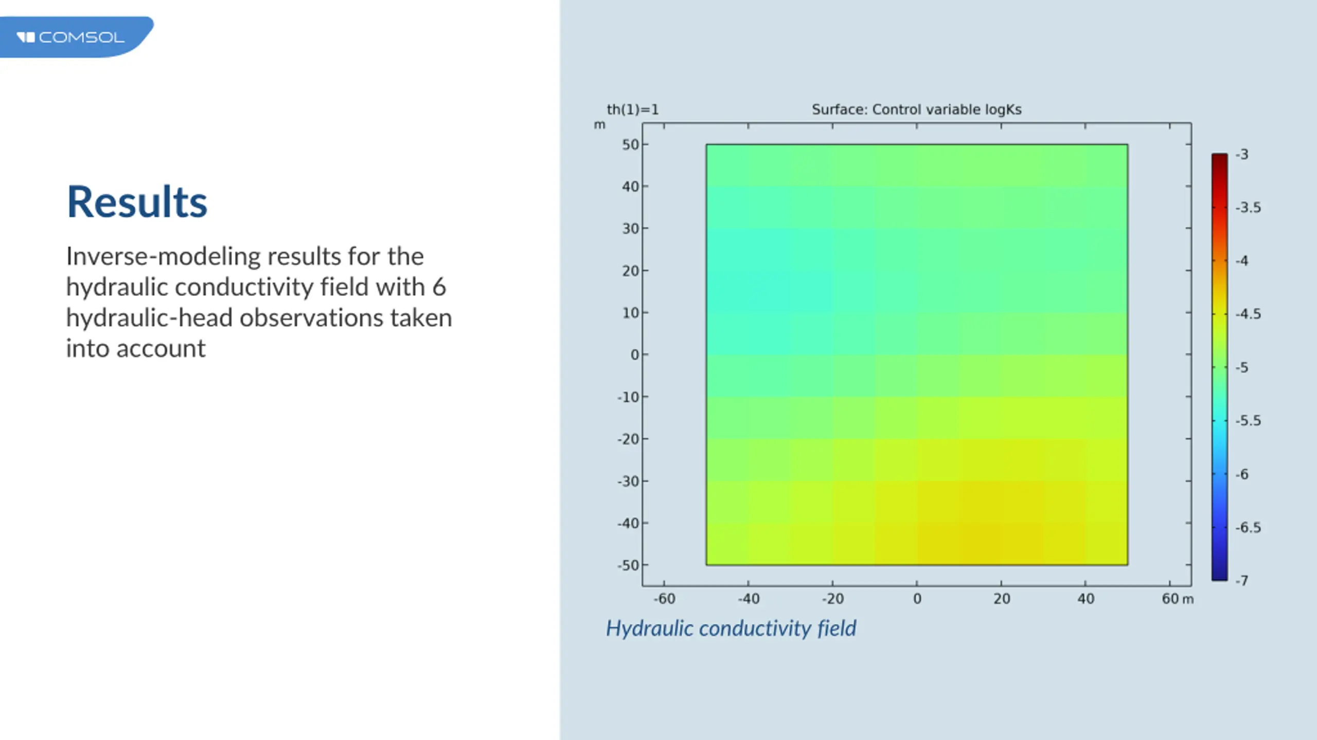 Results Inverse-modeling results for the hydraulic conductivity field with 6 hydraulic-head observations taken into account Hydraulic conductivity field
