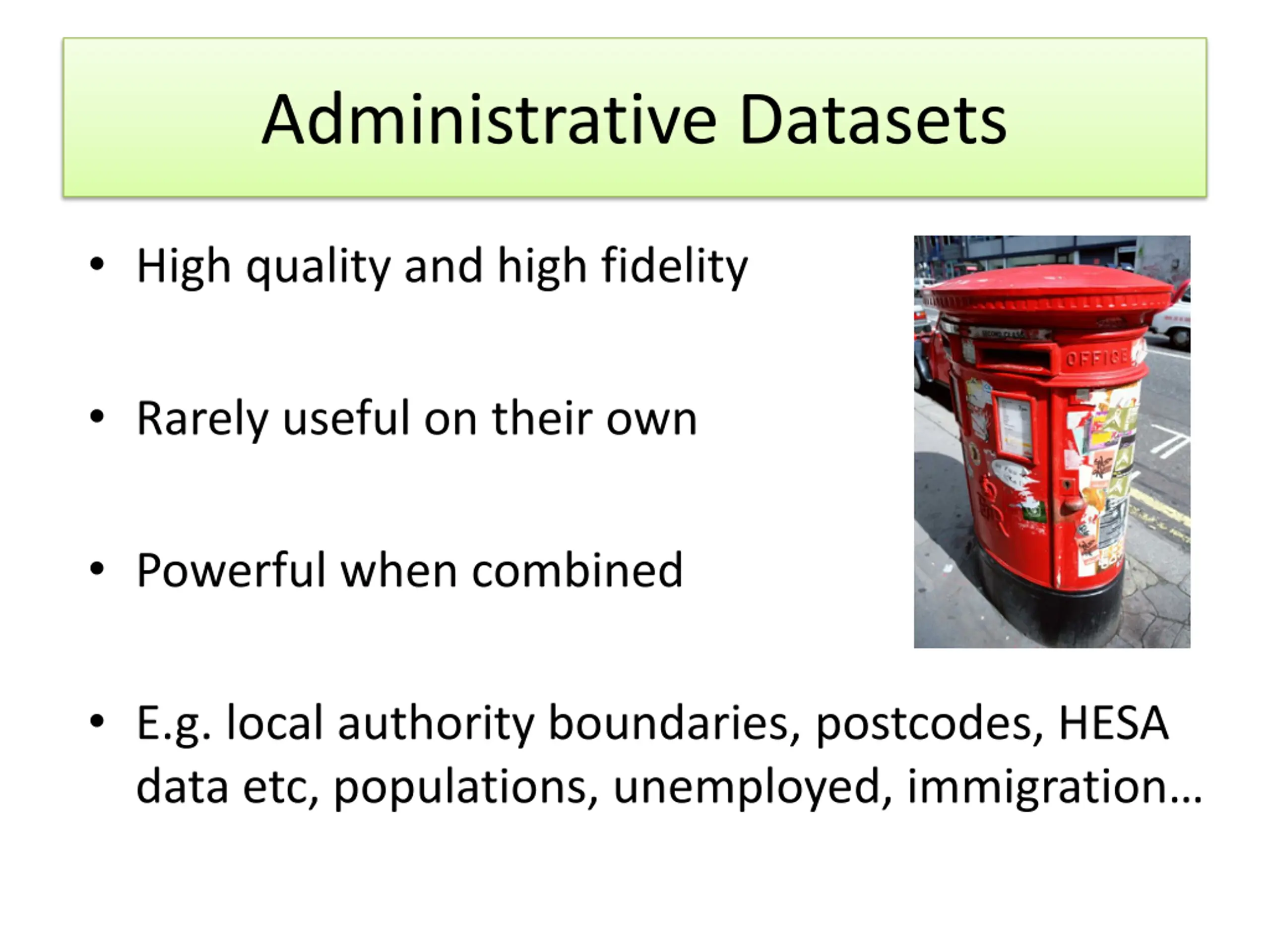Administrative Datasets High quality and high fidelity Rarely useful on their own Powerful when combined E.g. local authority boundaries, postcodes, HESA data etc, populations, unemployed, immigration