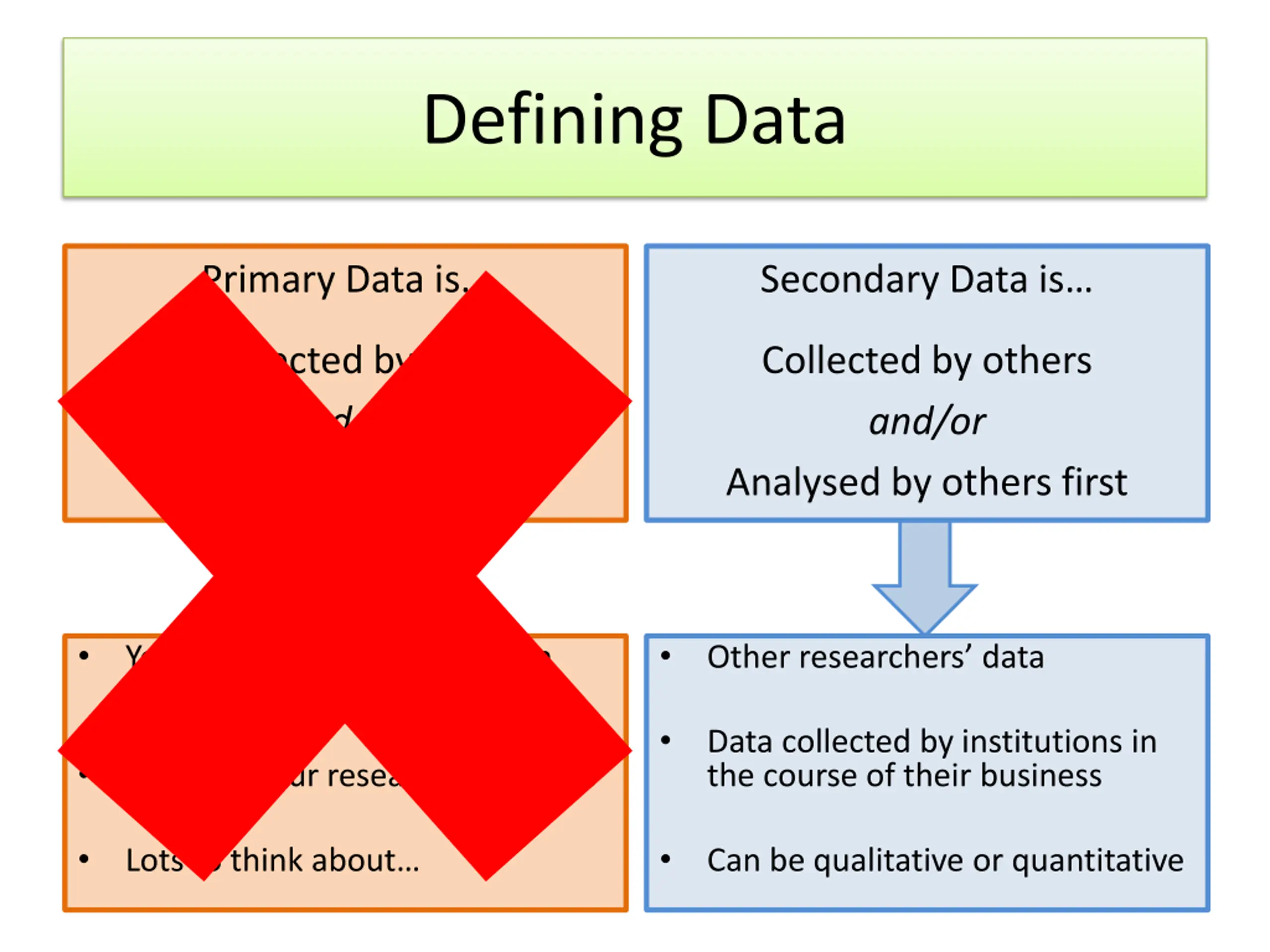Defining Data Primary Data is Secondary Data is Collected by you and/or Analysed by you first Collected by others and/or Analysed by others first You design the data collection instrument Other researchers data Data collected by institutions in the course of their business Answers your research questions Lots to think about Can be qualitative or quantitative