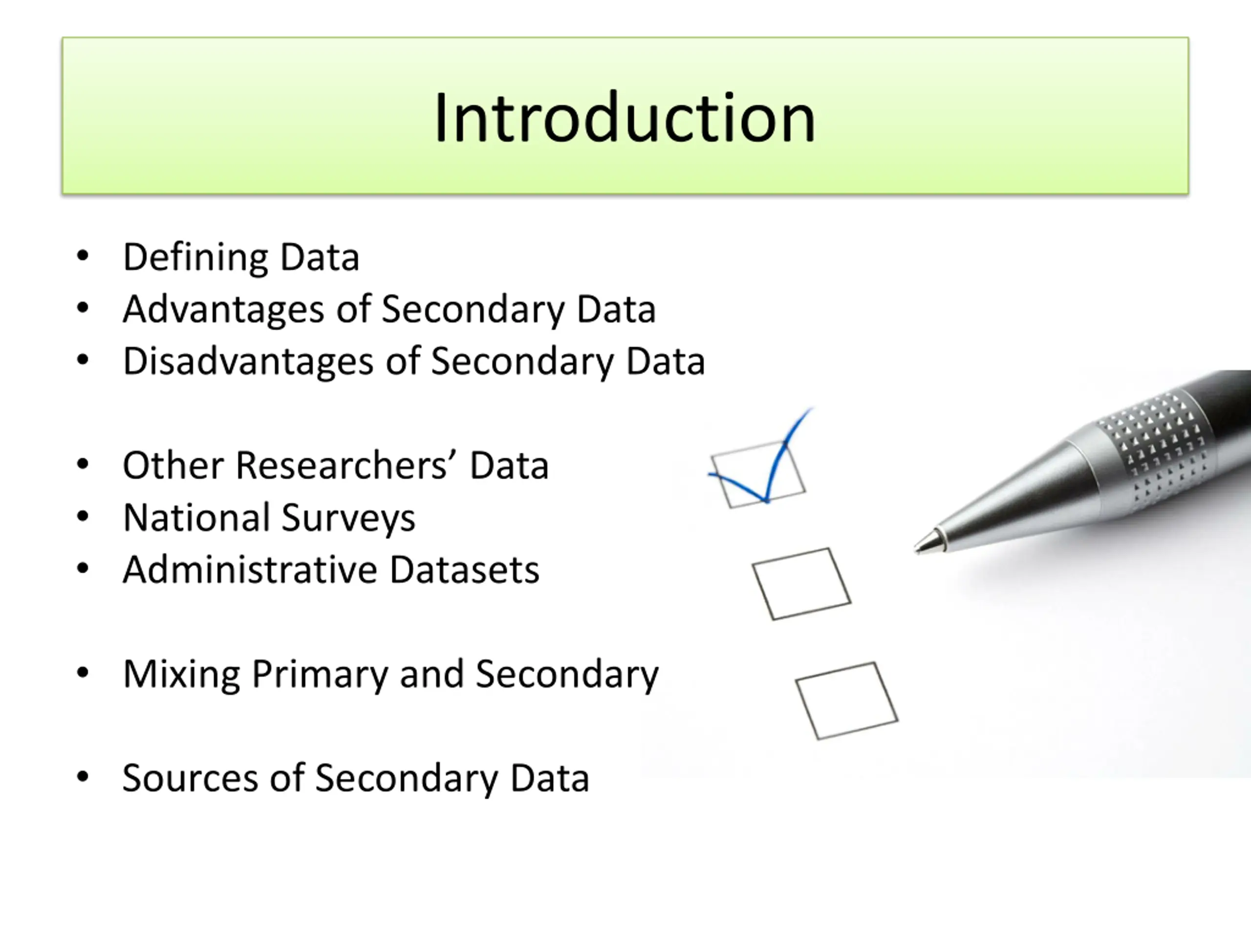 Introduction Defining Data Advantages of Secondary Data Disadvantages of Secondary Data Other Researchers Data National Surveys Administrative Datasets Mixing Primary and Secondary Sources of Secondary Data