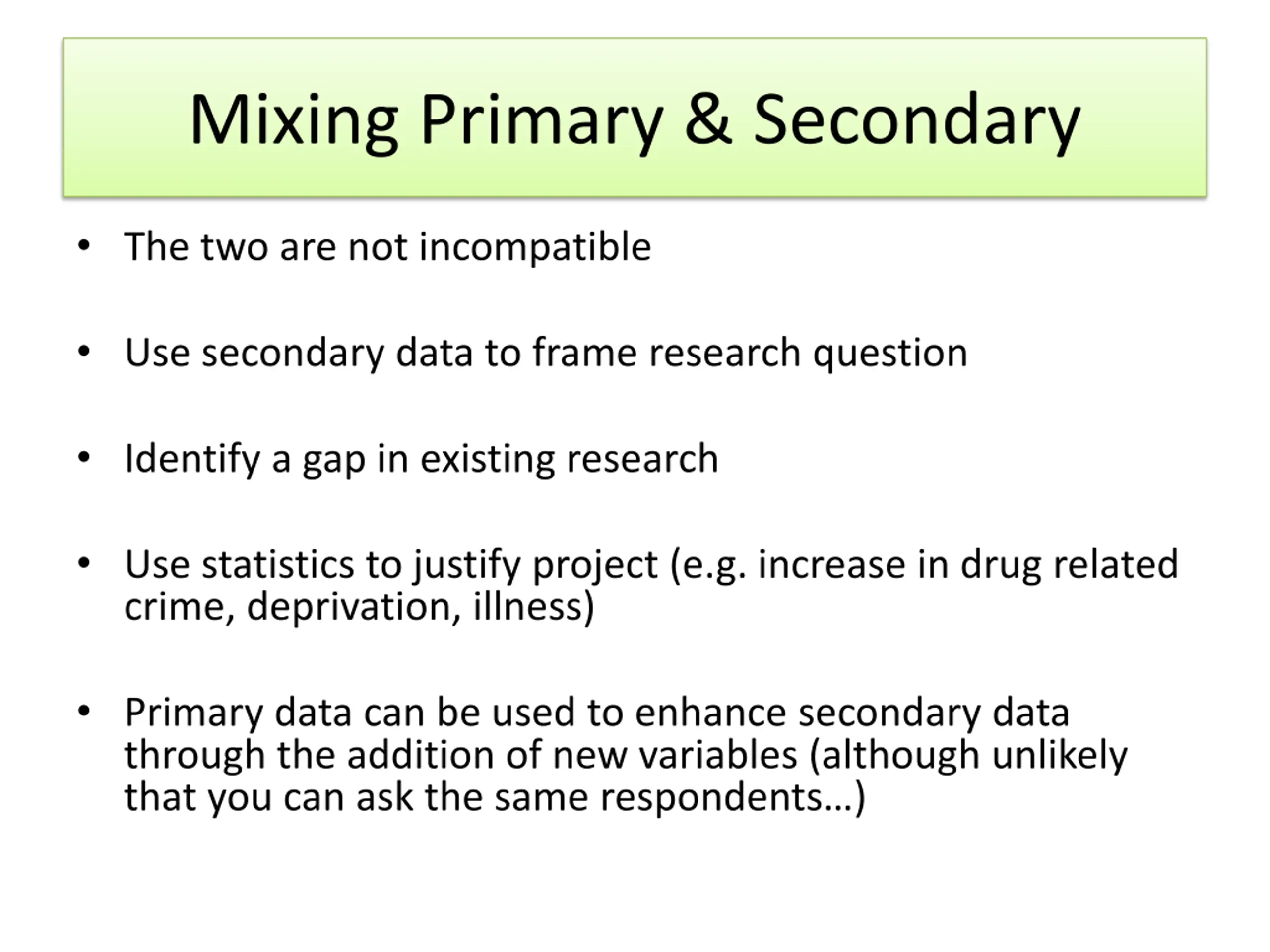 Mixing Primary & Secondary The two are not incompatible Use secondary data to frame research question Identify a gap in existing research Use statistics to justify project (e.g. increase in drug related crime, deprivation, illness) Primary data can be used to enhance secondary data through the addition of new variables (although unlikely that you can ask the same respondents )