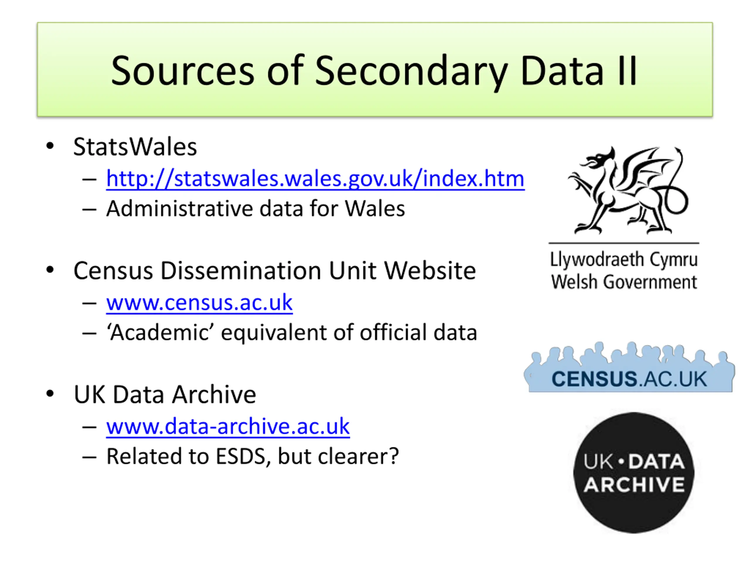 Sources of Secondary Data II StatsWales http://statswales.wales.gov.uk/index.htm Administrative data for Wales Census Dissemination Unit Website www.census.ac.uk Academic equivalent of official data UK Data Archive www.data-archive.ac.uk Related to ESDS, but clearer?