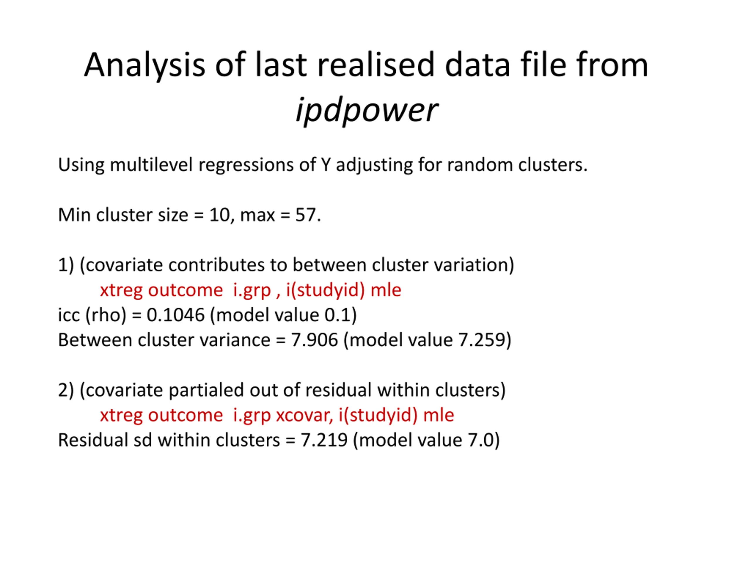 Analysis of last realised data file from ipdpower Using multilevel regressions of Y adjusting for random clusters. Min cluster size = 10, max = 57. 1) (covariate contributes to between cluster variation) xtreg outcome i.grp , i(studyid) mle icc (rho) = 0.1046 (model value 0.1) Between cluster variance = 7.906 (model value 7.259) 2) (covariate partialed out of residual within clusters) xtreg outcome i.grp xcovar, i(studyid) mle Residual sd within clusters = 7.219 (model value 7.0)