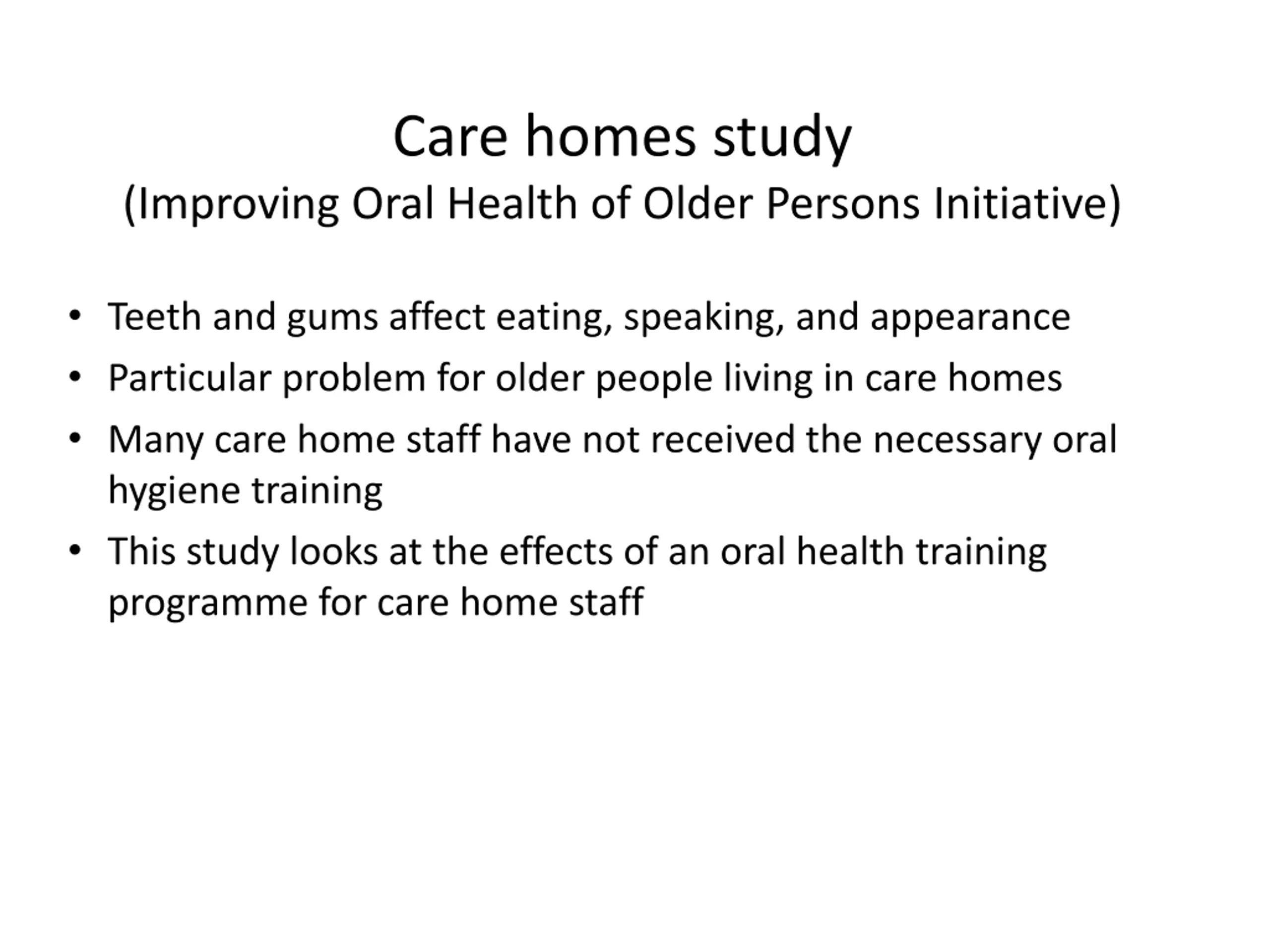Care homes study (Improving Oral Health of Older Persons Initiative) Teeth and gums affect eating, speaking, and appearance Particular problem for older people living in care homes Many care home staff have not received the necessary oral hygiene training This study looks at the effects of an oral health training programme for care home staff