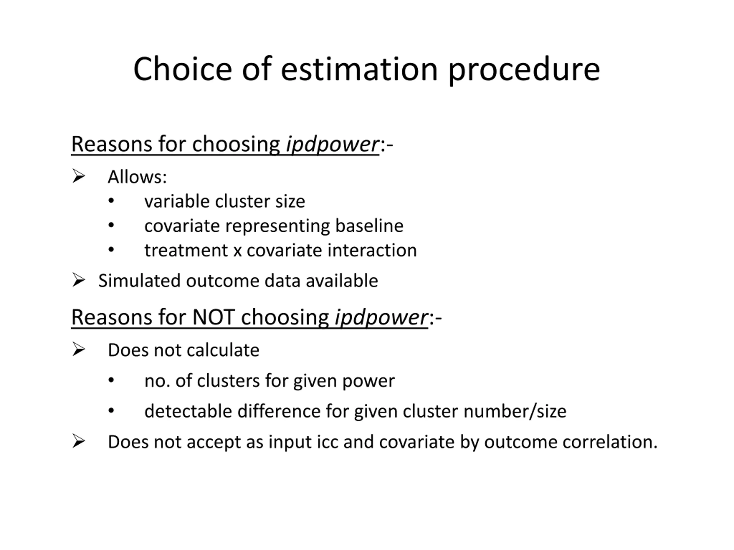 Choice of estimation procedure Reasons for choosing ipdpower:- Allows: variable cluster size covariate representing baseline treatment x covariate interaction Simulated outcome data available Reasons for NOT choosing ipdpower:- Does not calculate no. of clusters for given power detectable difference for given cluster number/size Does not accept as input icc and covariate by outcome correlation.