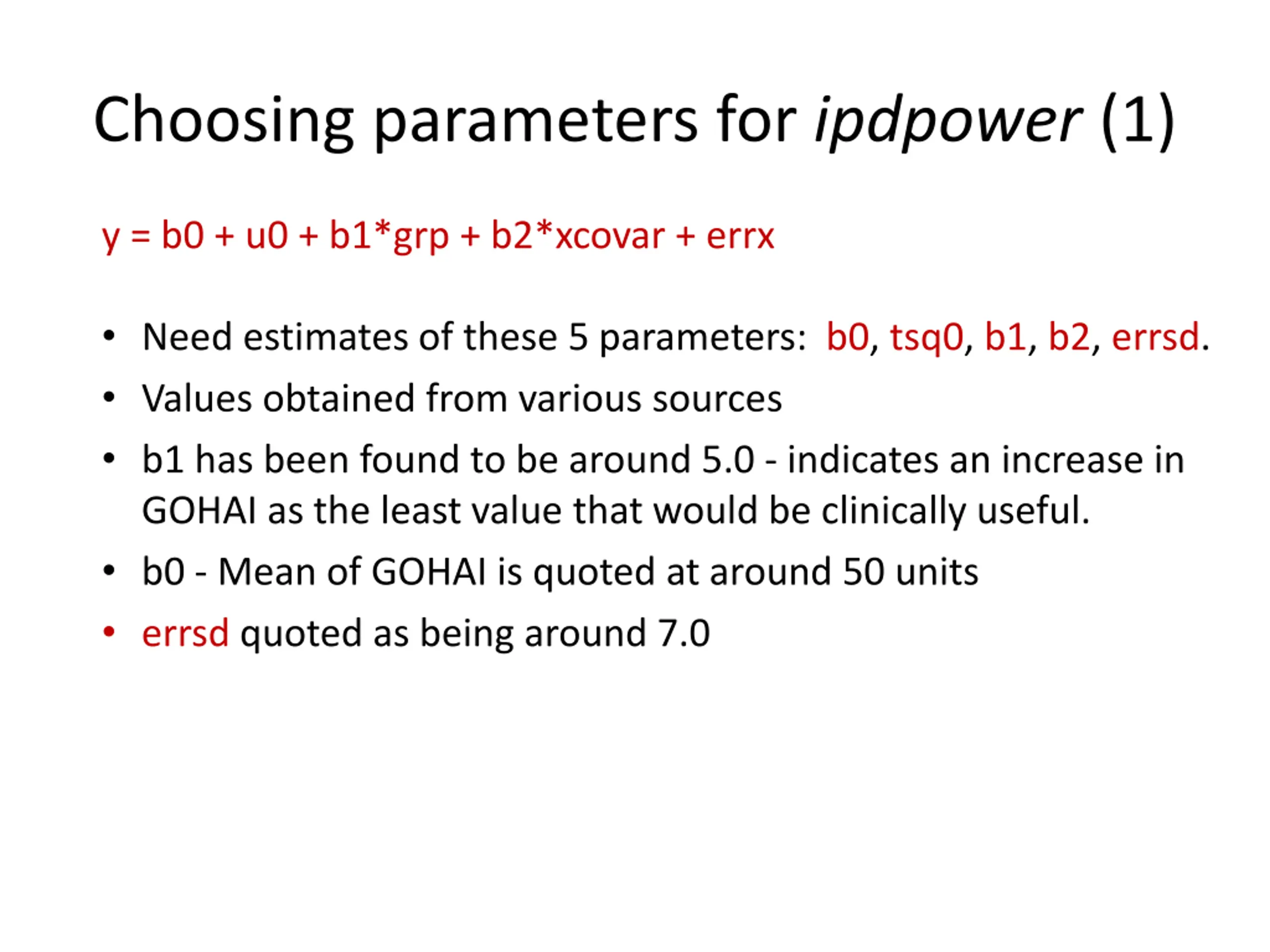 Choosing parameters for ipdpower (1) y = b0 + u0 + b1*grp + b2*xcovar + errx Need estimates of these 5 parameters: b0, tsq0, b1, b2, errsd. Values obtained from various sources b1 has been found to be around 5.0 - indicates an increase in GOHAI as the least value that would be clinically useful. b0 - Mean of GOHAI is quoted at around 50 units errsd quoted as being around 7.0
