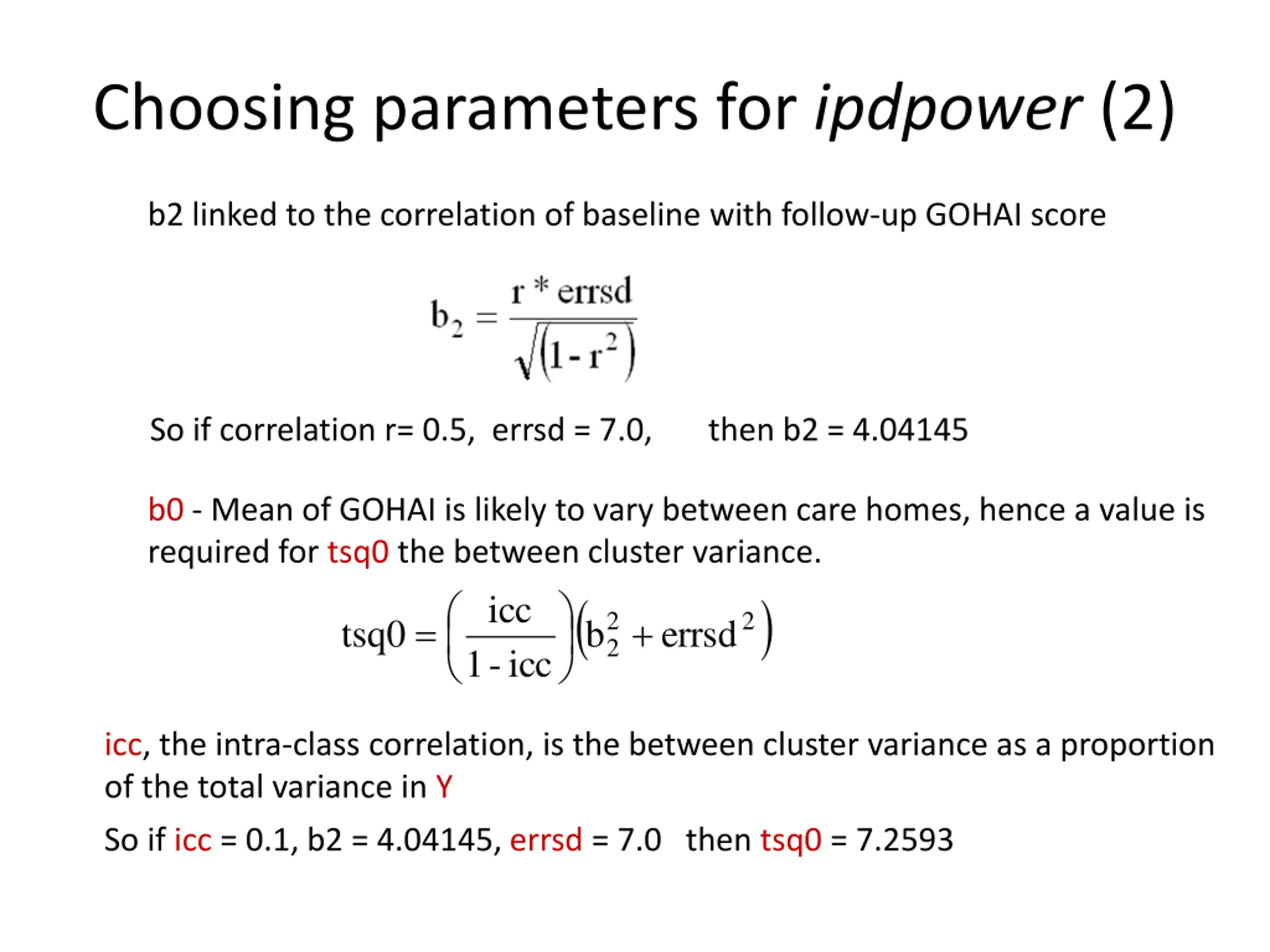 Choosing parameters for ipdpower (2) b2 linked to the correlation of baseline with follow-up GOHAI score So if correlation r= 0.5, errsd = 7.0, then b2 = 4.04145 b0 - Mean of GOHAI is likely to vary between care homes, hence a value is required for tsq0 the between cluster variance. ( 2 errsd b icc - 1 ) icc 2 2 = + tsq0 icc, the intra-class correlation, is the between cluster variance as a proportion of the total variance in Y So if icc = 0.1, b2 = 4.04145, errsd = 7.0 then tsq0 = 7.2593