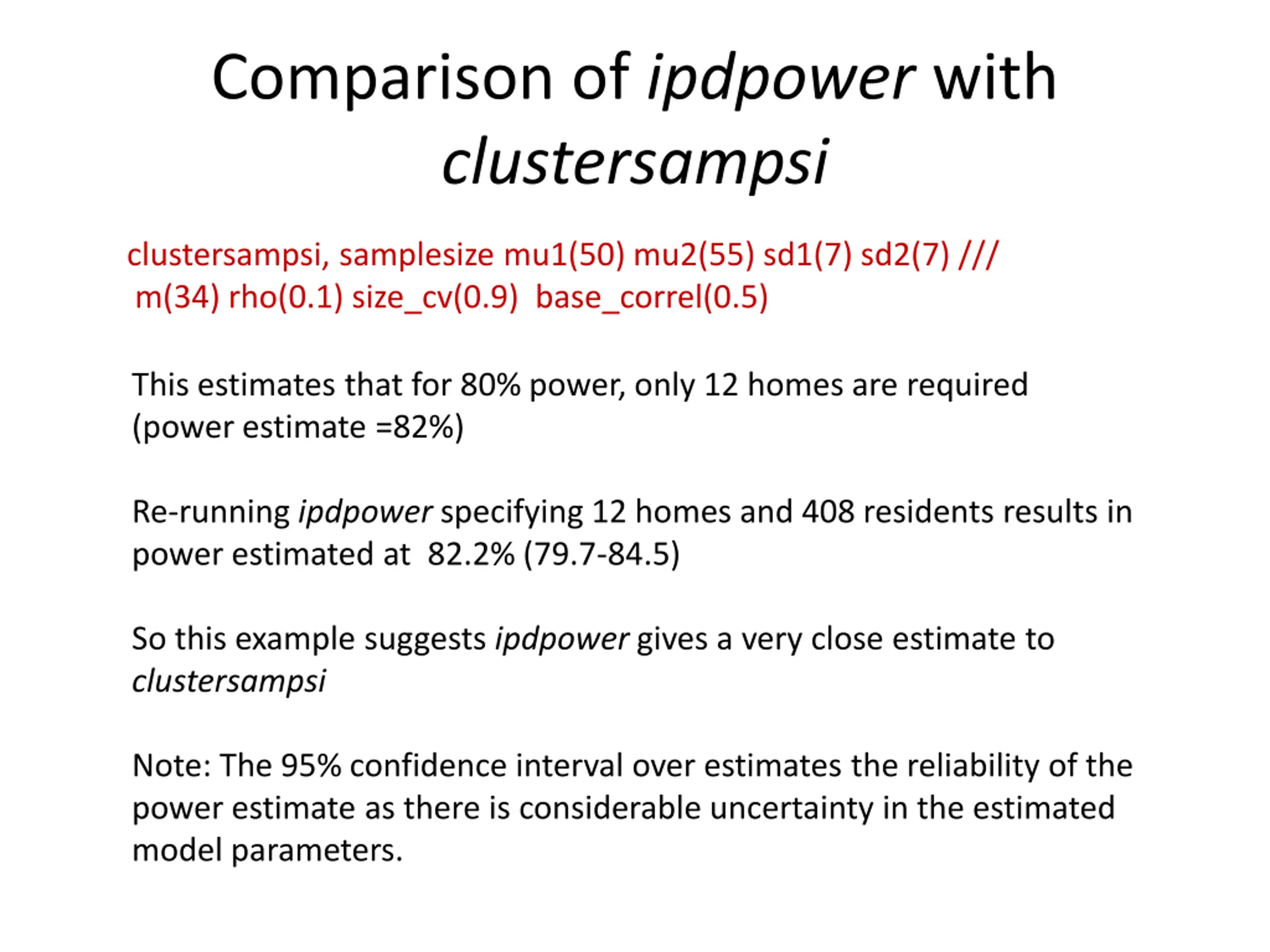 Comparison of ipdpower with clustersampsi clustersampsi, samplesize mu1(50) mu2(55) sd1(7) sd2(7) /// m(34) rho(0.1) size_cv(0.9) base_correl(0.5) This estimates that for 80% power, only 12 homes are required (power estimate =82%) Re-running ipdpower specifying 12 homes and 408 residents results in power estimated at 82.2% (79.7-84.5) So this example suggests ipdpower gives a very close estimate to clustersampsi Note: The 95% confidence interval over estimates the reliability of the power estimate as there is considerable uncertainty in the estimated model parameters.