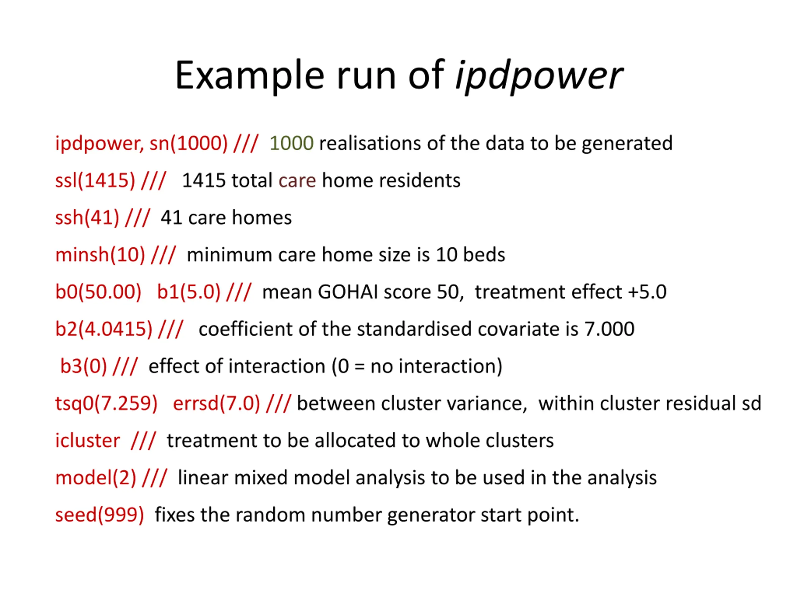 Example run of ipdpower ipdpower, sn(1000) /// 1000 realisations of the data to be generated ssl(1415) /// 1415 total care home residents ssh(41) /// 41 care homes minsh(10) /// minimum care home size is 10 beds b0(50.00) b1(5.0) /// mean GOHAI score 50, treatment effect +5.0 b2(4.0415) /// coefficient of the standardised covariate is 7.000 b3(0) /// effect of interaction (0 = no interaction) tsq0(7.259) errsd(7.0) /// between cluster variance, within cluster residual sd icluster /// treatment to be allocated to whole clusters model(2) /// linear mixed model analysis to be used in the analysis seed(999) fixes the random number generator start point.