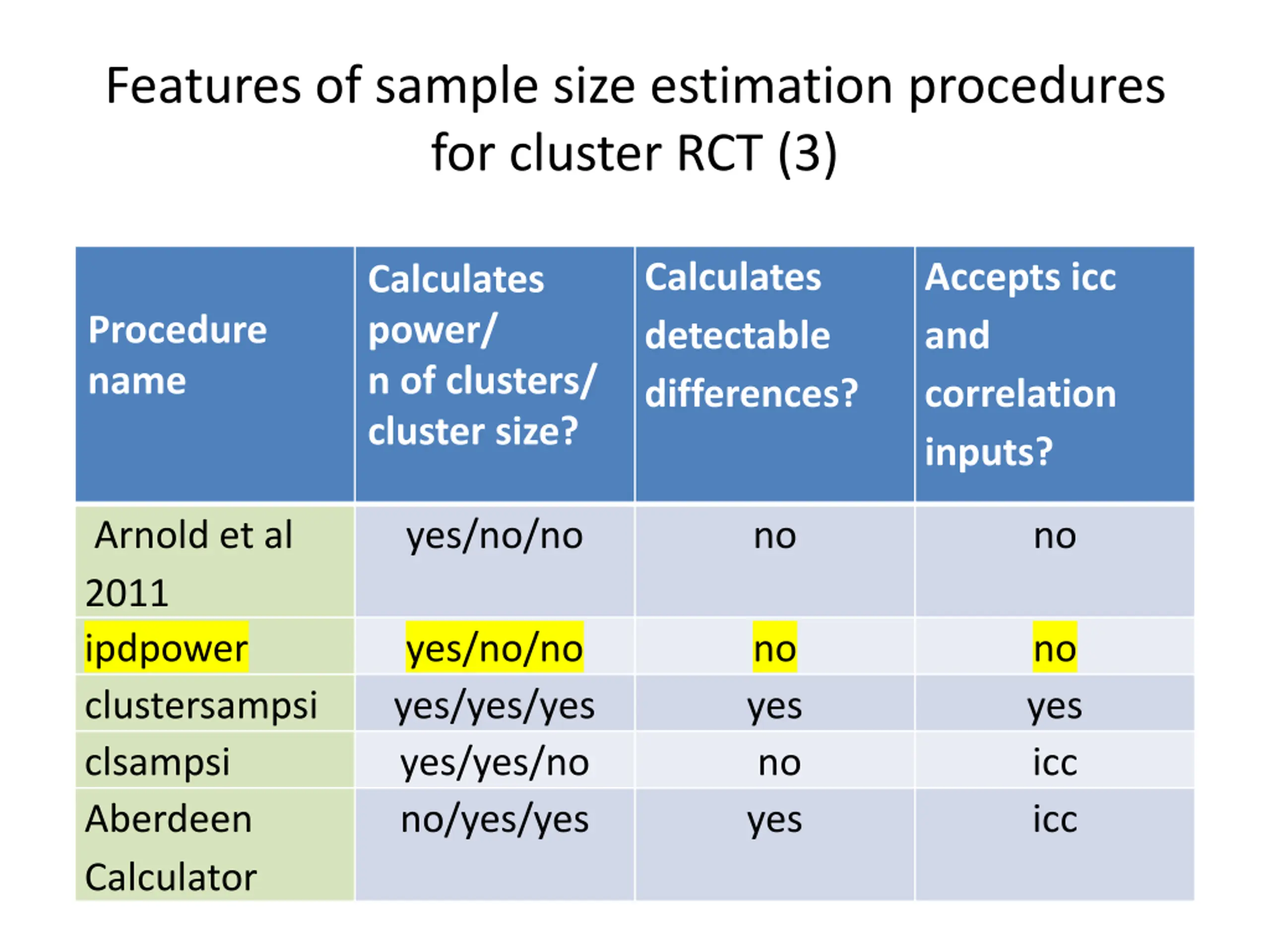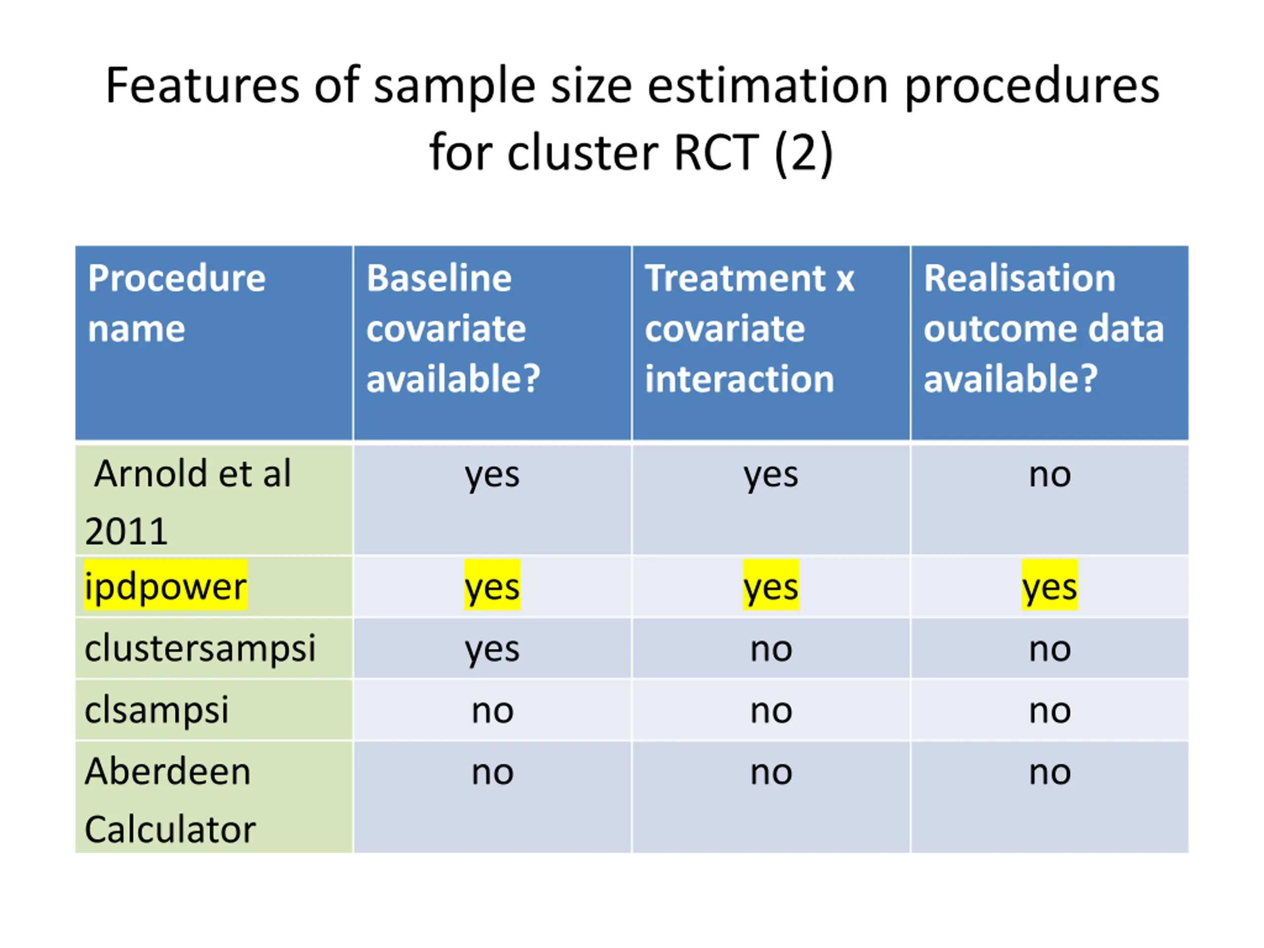 Features of sample size estimation procedures for cluster RCT (2) Procedure name Baseline covariate available? Treatment x covariate interaction Realisation outcome data available? Arnold et al 2011 ipdpower clustersampsi clsampsi Aberdeen Calculator yes yes no yes yes no no yes no no no yes no no no