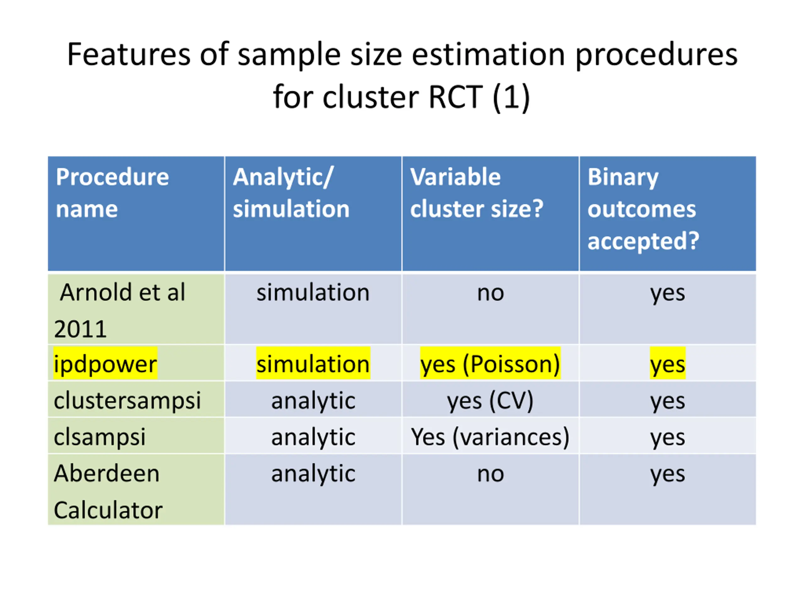 Features of sample size estimation procedures for cluster RCT (1) Procedure name Analytic/ simulation Variable cluster size? Binary outcomes accepted? Arnold et al 2011 ipdpower clustersampsi clsampsi Aberdeen Calculator simulation no yes simulation analytic analytic analytic yes (Poisson) yes (CV) Yes (variances) no yes yes yes yes