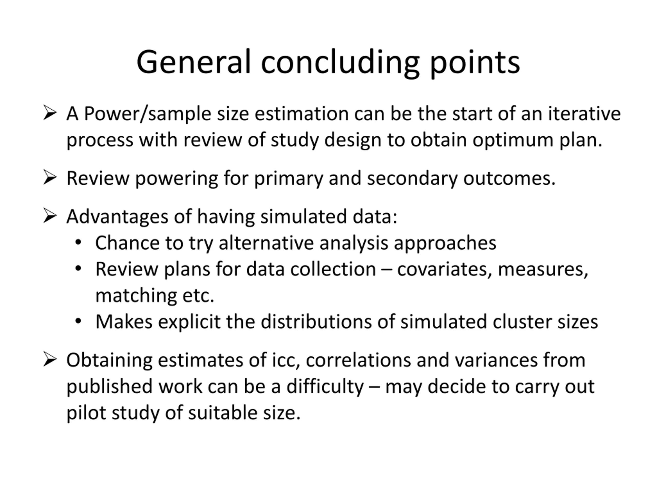 General concluding points A Power/sample size estimation can be the start of an iterative process with review of study design to obtain optimum plan. Review powering for primary and secondary outcomes. Advantages of having simulated data: Chance to try alternative analysis approaches Review plans for data collection covariates, measures, matching etc. Makes explicit the distributions of simulated cluster sizes Obtaining estimates of icc, correlations and variances from published work can be a difficulty may decide to carry out pilot study of suitable size.
