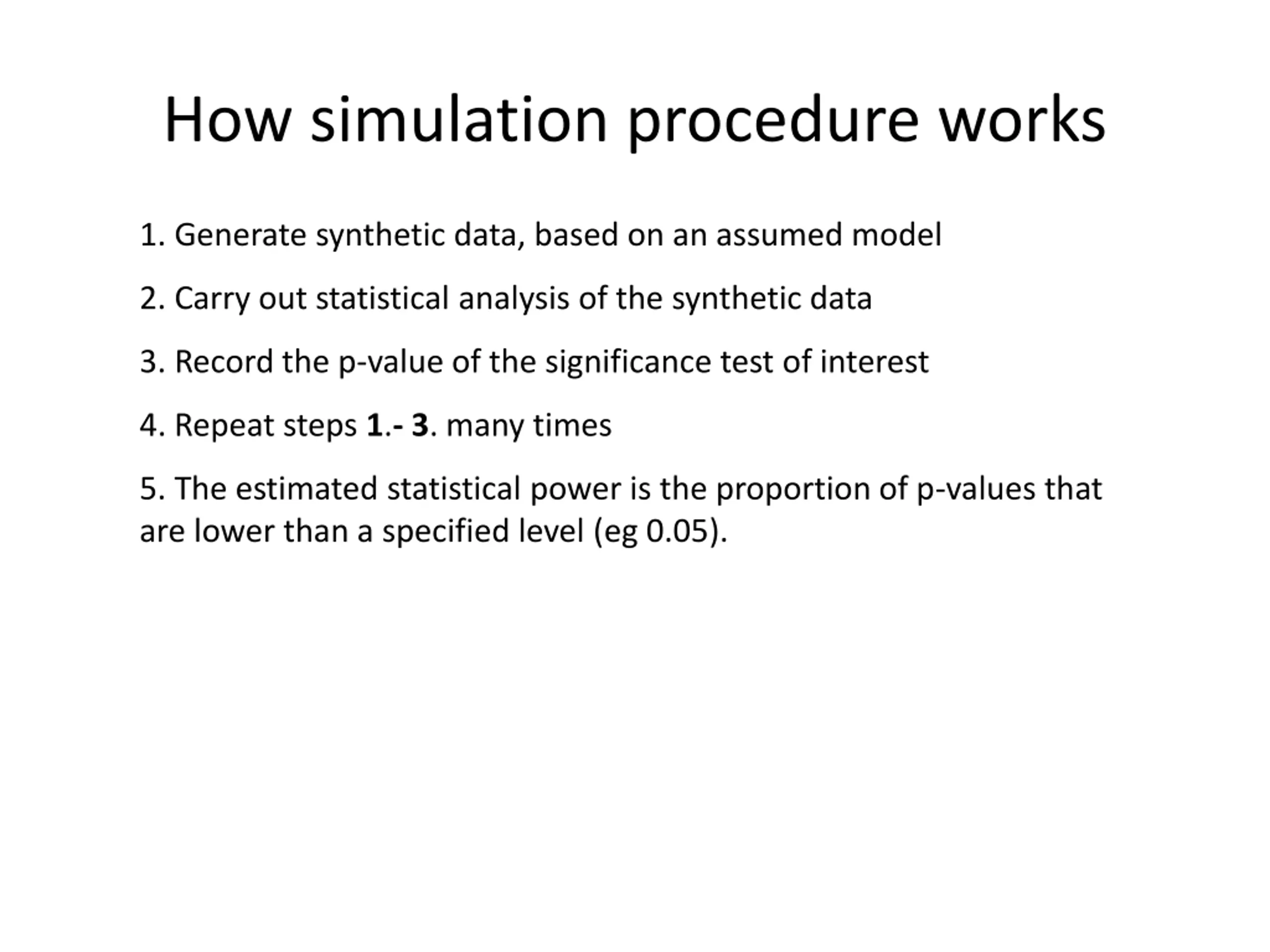 How simulation procedure works 1. Generate synthetic data, based on an assumed model 2. Carry out statistical analysis of the synthetic data 3. Record the p-value of the significance test of interest 4. Repeat steps 1.-3. many times 5. The estimated statistical power is the proportion of p-values that are lower than a specified level (eg 0.05).