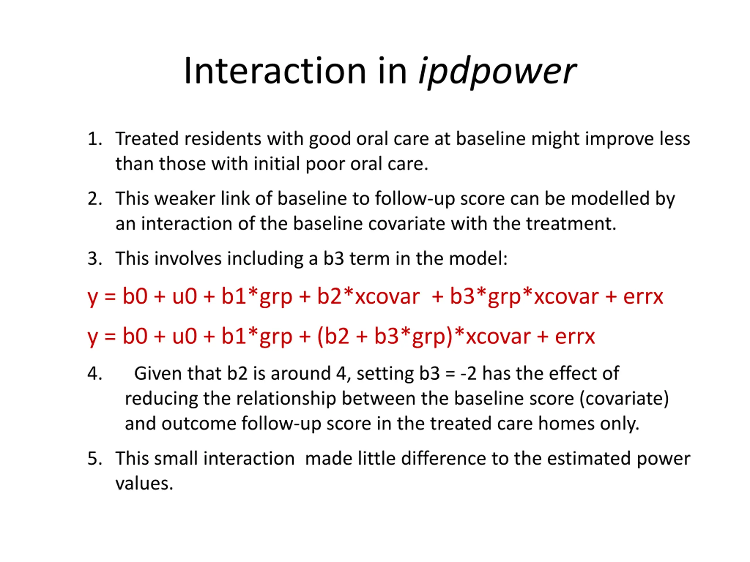 Interaction in ipdpower 1. Treated residents with good oral care at baseline might improve less than those with initial poor oral care. 2. This weaker link of baseline to follow-up score can be modelled by an interaction of the baseline covariate with the treatment. 3. This involves including a b3 term in the model: y = b0 + u0 + b1*grp + b2*xcovar + b3*grp*xcovar + errx y = b0 + u0 + b1*grp + (b2 + b3*grp)*xcovar + errx 4. Given that b2 is around 4, setting b3 = -2 has the effect of reducing the relationship between the baseline score (covariate) and outcome follow-up score in the treated care homes only. 5. This small interaction made little difference to the estimated power values.