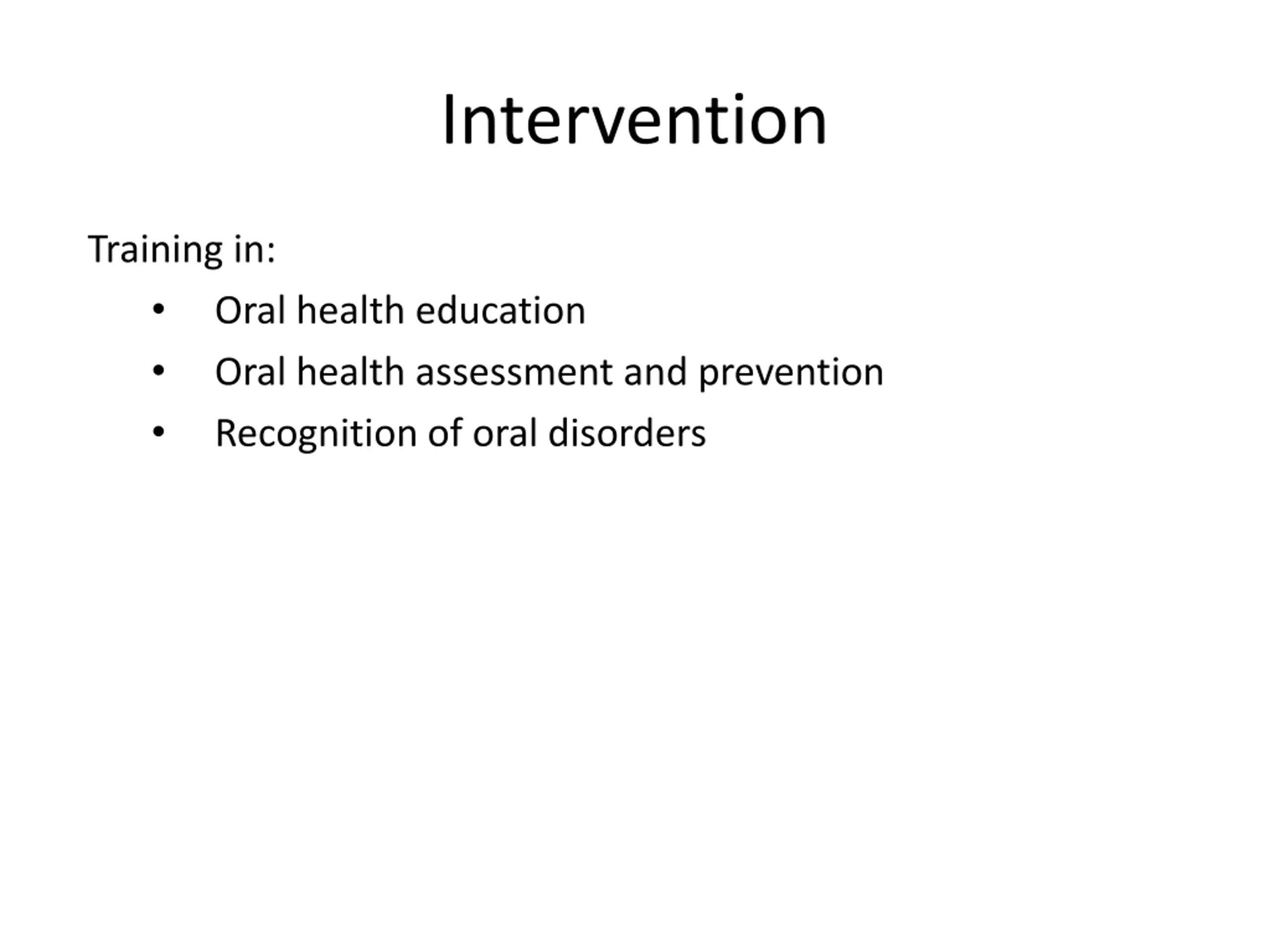 Intervention Training in: Oral health education Oral health assessment and prevention Recognition of oral disorders