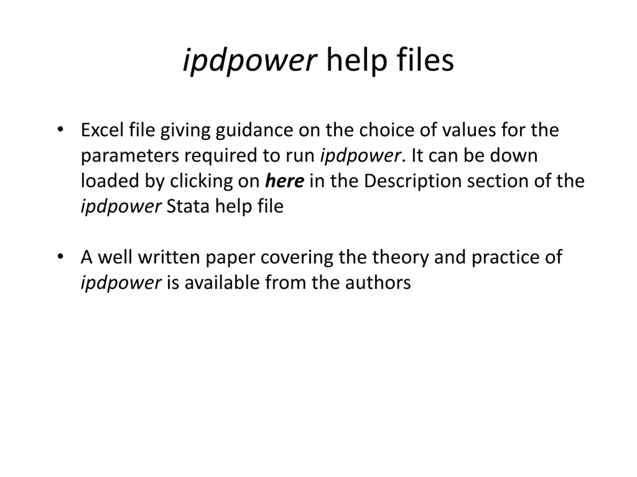 ipdpower help files Excel file giving guidance on the choice of values for the parameters required to run ipdpower. It can be down loaded by clicking on here in the Description section of the ipdpower Stata help file A well written paper covering the theory and practice of ipdpower is available from the authors