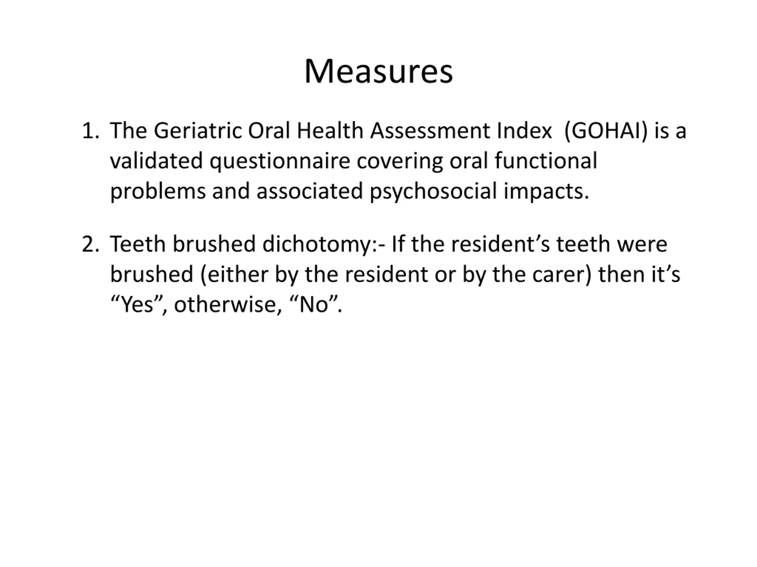 Measures 1. The Geriatric Oral Health Assessment Index (GOHAI) is a validated questionnaire covering oral functional problems and associated psychosocial impacts. 2. Teeth brushed dichotomy:- If the resident s teeth were brushed (either by the resident or by the carer) then it s Yes , otherwise, No .