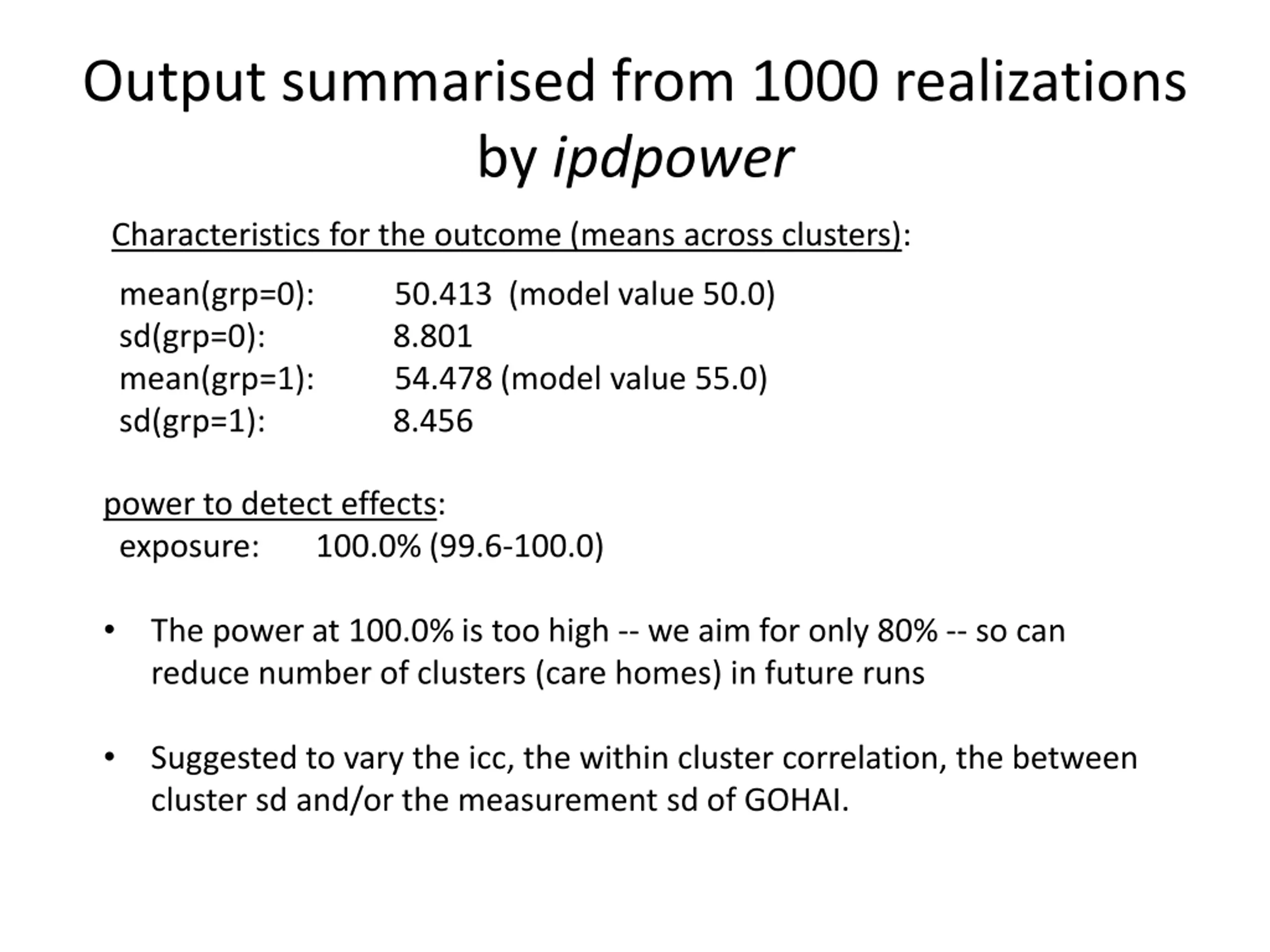 Output summarised from 1000 realizations by ipdpower Characteristics for the outcome (means across clusters): mean(grp=0): 50.413 (model value 50.0) sd(grp=0): 8.801 mean(grp=1): 54.478 (model value 55.0) sd(grp=1): 8.456 power to detect effects: exposure: 100.0% (99.6-100.0) The power at 100.0% is too high -- we aim for only 80% -- so can reduce number of clusters (care homes) in future runs Suggested to vary the icc, the within cluster correlation, the between cluster sd and/or the measurement sd of GOHAI.