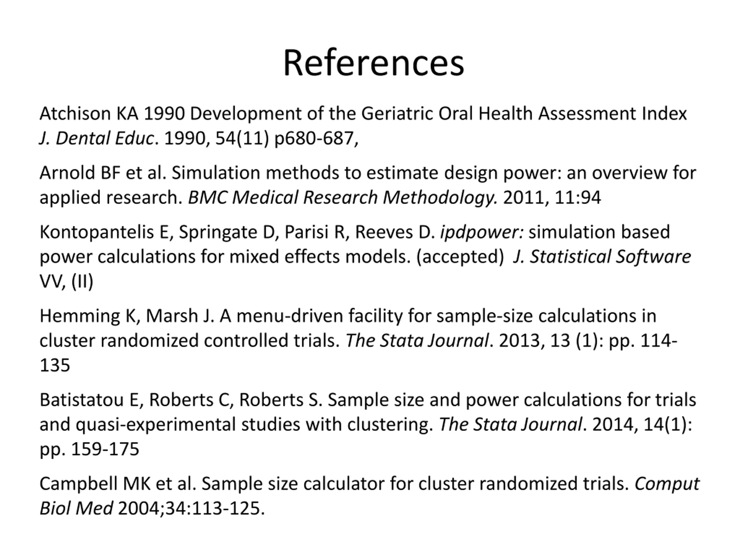 References Atchison KA 1990 Development of the Geriatric Oral Health Assessment Index J. Dental Educ. 1990, 54(11) p680-687, Arnold BF et al. Simulation methods to estimate design power: an overview for applied research. BMC Medical Research Methodology. 2011, 11:94 Kontopantelis E, Springate D, Parisi R, Reeves D. ipdpower: simulation based power calculations for mixed effects models. (accepted) J. Statistical Software VV, (II) Hemming K, Marsh J. A menu-driven facility for sample-size calculations in cluster randomized controlled trials. The Stata Journal. 2013, 13 (1): pp. 114- 135 Batistatou E, Roberts C, Roberts S. Sample size and power calculations for trials and quasi-experimental studies with clustering. The Stata Journal. 2014, 14(1): pp. 159-175 Campbell MK et al. Sample size calculator for cluster randomized trials. Comput Biol Med 2004;34:113-125.