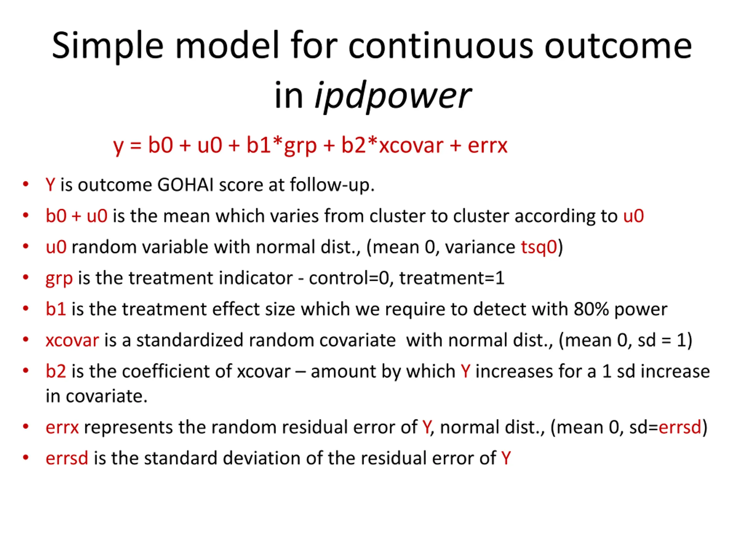 Simple model for continuous outcome in ipdpower y = b0 + u0 + b1*grp + b2*xcovar + errx Y is outcome GOHAI score at follow-up. b0 + u0 is the mean which varies from cluster to cluster according to u0 u0 random variable with normal dist., (mean 0, variance tsq0) grp is the treatment indicator - control=0, treatment=1 b1 is the treatment effect size which we require to detect with 80% power xcovar is a standardized random covariate with normal dist., (mean 0, sd = 1) b2 is the coefficient of xcovar amount by which Y increases for a 1 sd increase in covariate. errx represents the random residual error of Y, normal dist., (mean 0, sd=errsd) errsd is the standard deviation of the residual error of Y