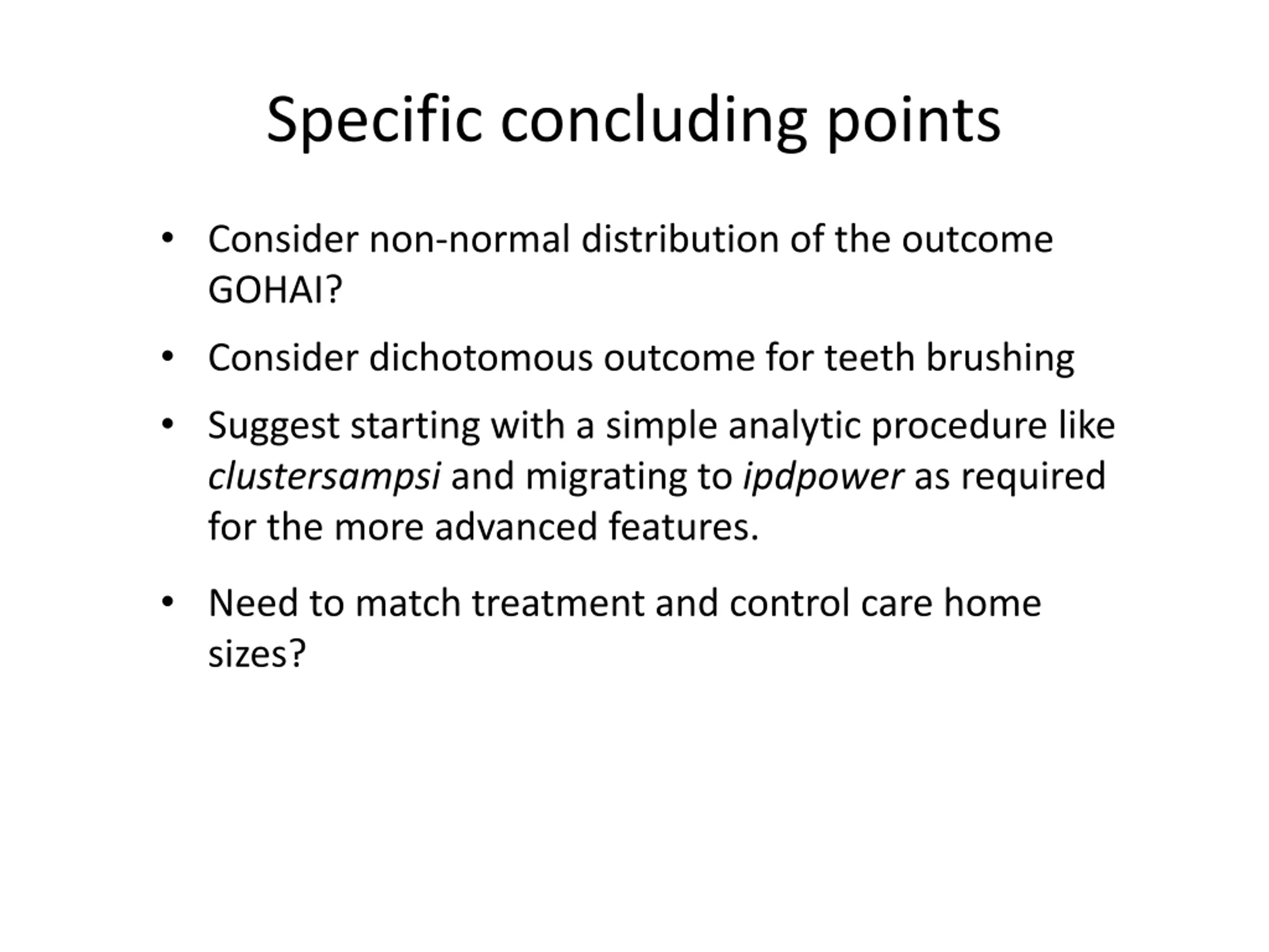 Specific concluding points Consider non-normal distribution of the outcome GOHAI? Consider dichotomous outcome for teeth brushing Suggest starting with a simple analytic procedure like clustersampsi and migrating to ipdpower as required for the more advanced features. Need to match treatment and control care home sizes?