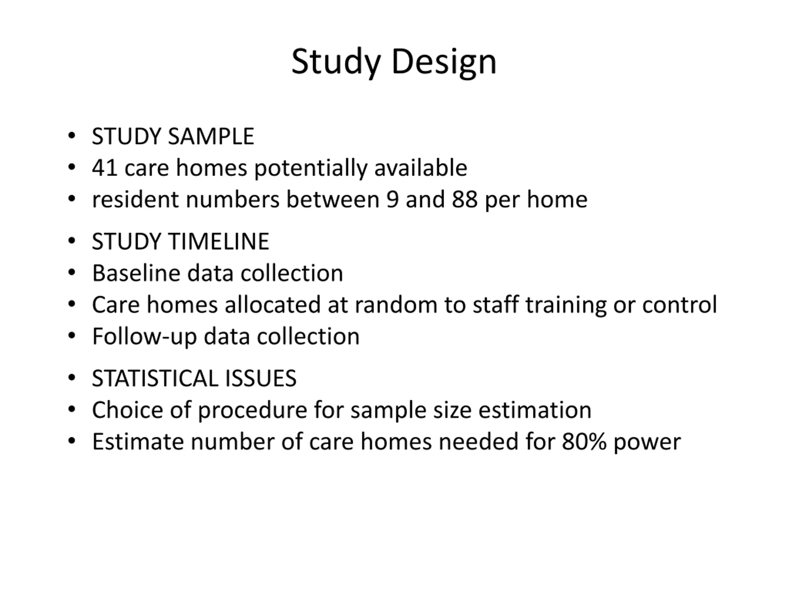 Study Design STUDY SAMPLE 41 care homes potentially available resident numbers between 9 and 88 per home STUDY TIMELINE Baseline data collection Care homes allocated at random to staff training or control Follow-up data collection STATISTICAL ISSUES Choice of procedure for sample size estimation Estimate number of care homes needed for 80% power