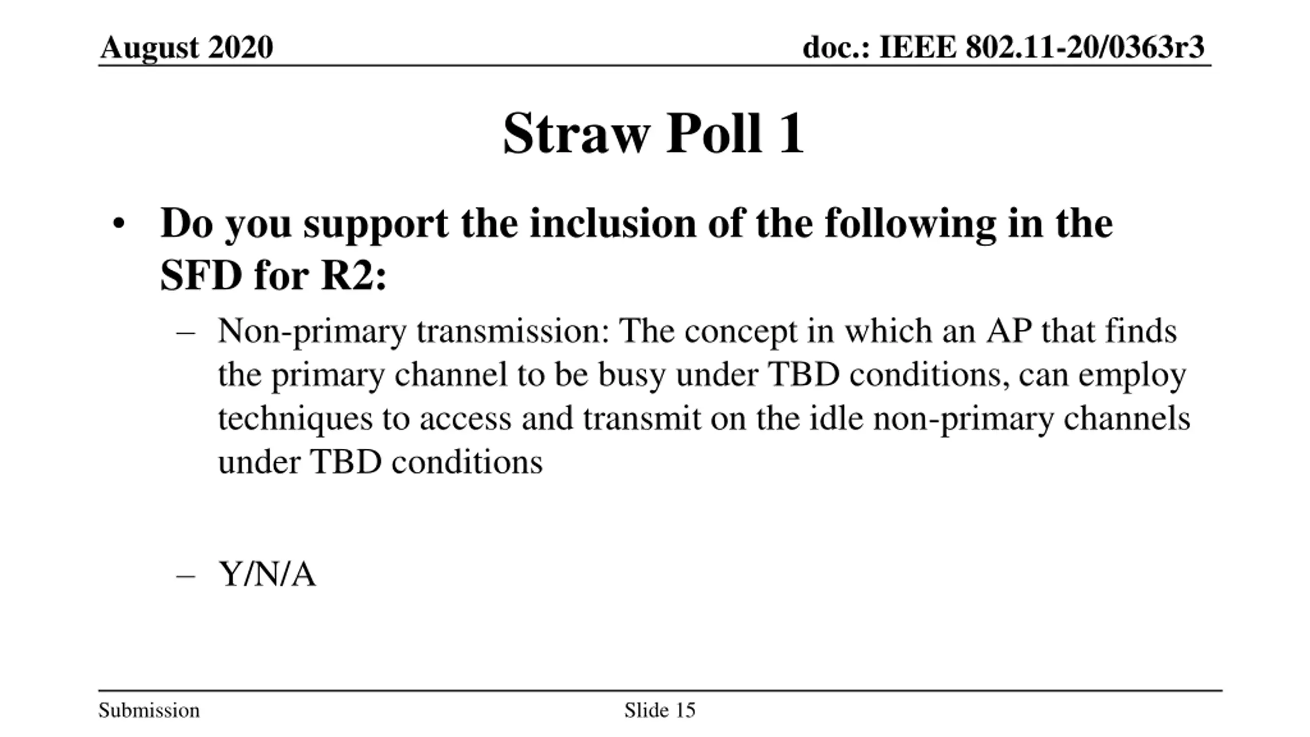 doc.: IEEE 802.11-20/0363r3 August 2020 Straw Poll 1 Do you support the inclusion of the following in the SFD for R2: Non-primary transmission: The concept in which an AP that finds the primary channel to be busy under TBD conditions, can employ techniques to access and transmit on the idle non-primary channels under TBD conditions Y/N/A Submission Slide 15