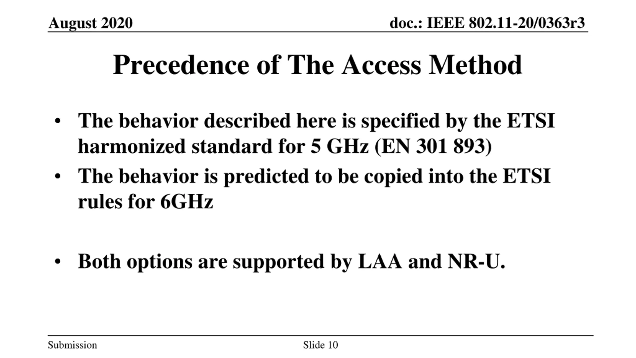 doc.: IEEE 802.11-20/0363r3 August 2020 Precedence of The Access Method The behavior described here is specified by the ETSI harmonized standard for 5 GHz (EN 301 893) The behavior is predicted to be copied into the ETSI rules for 6GHz Both options are supported by LAA and NR-U. Submission Slide 10
