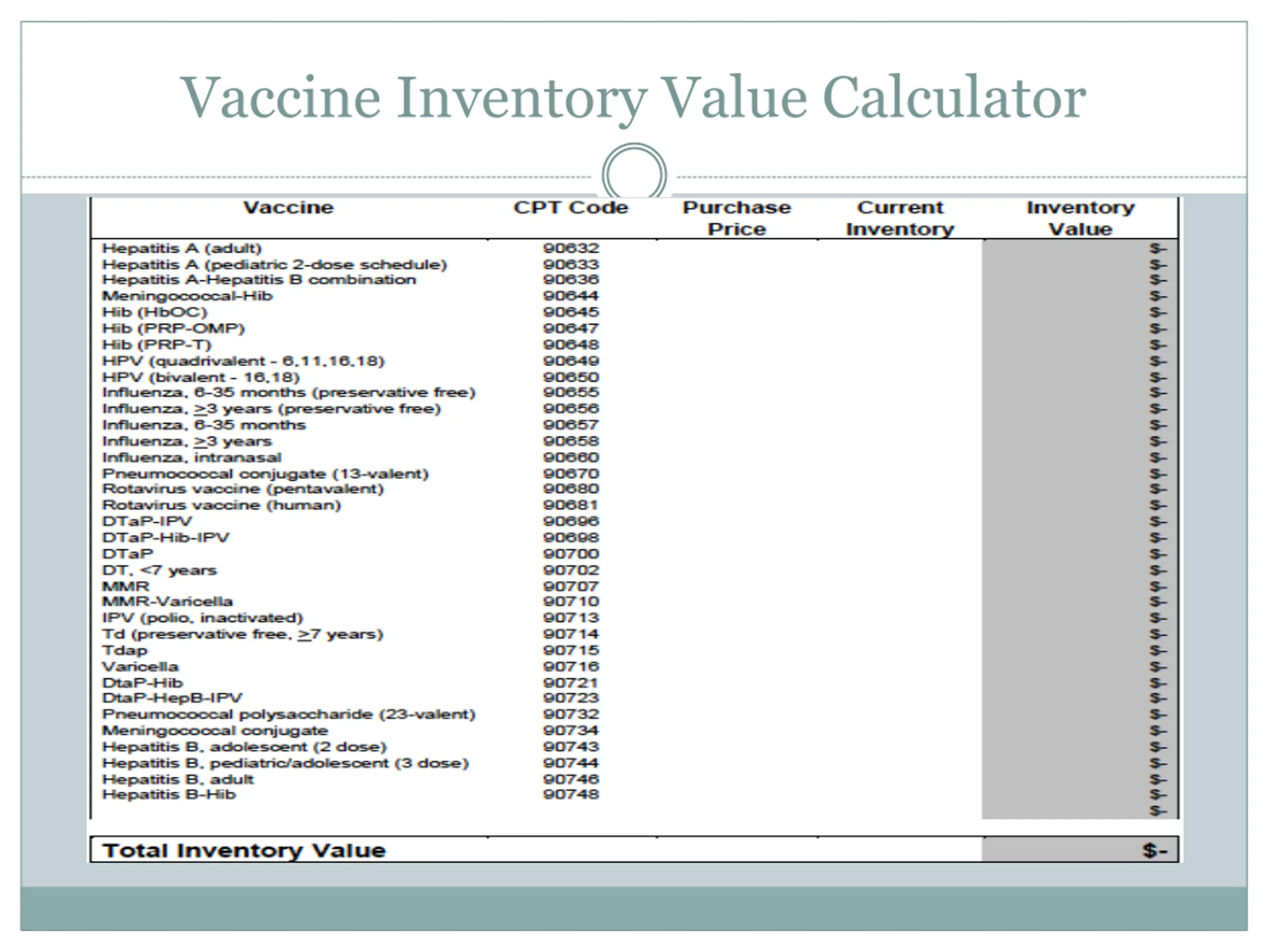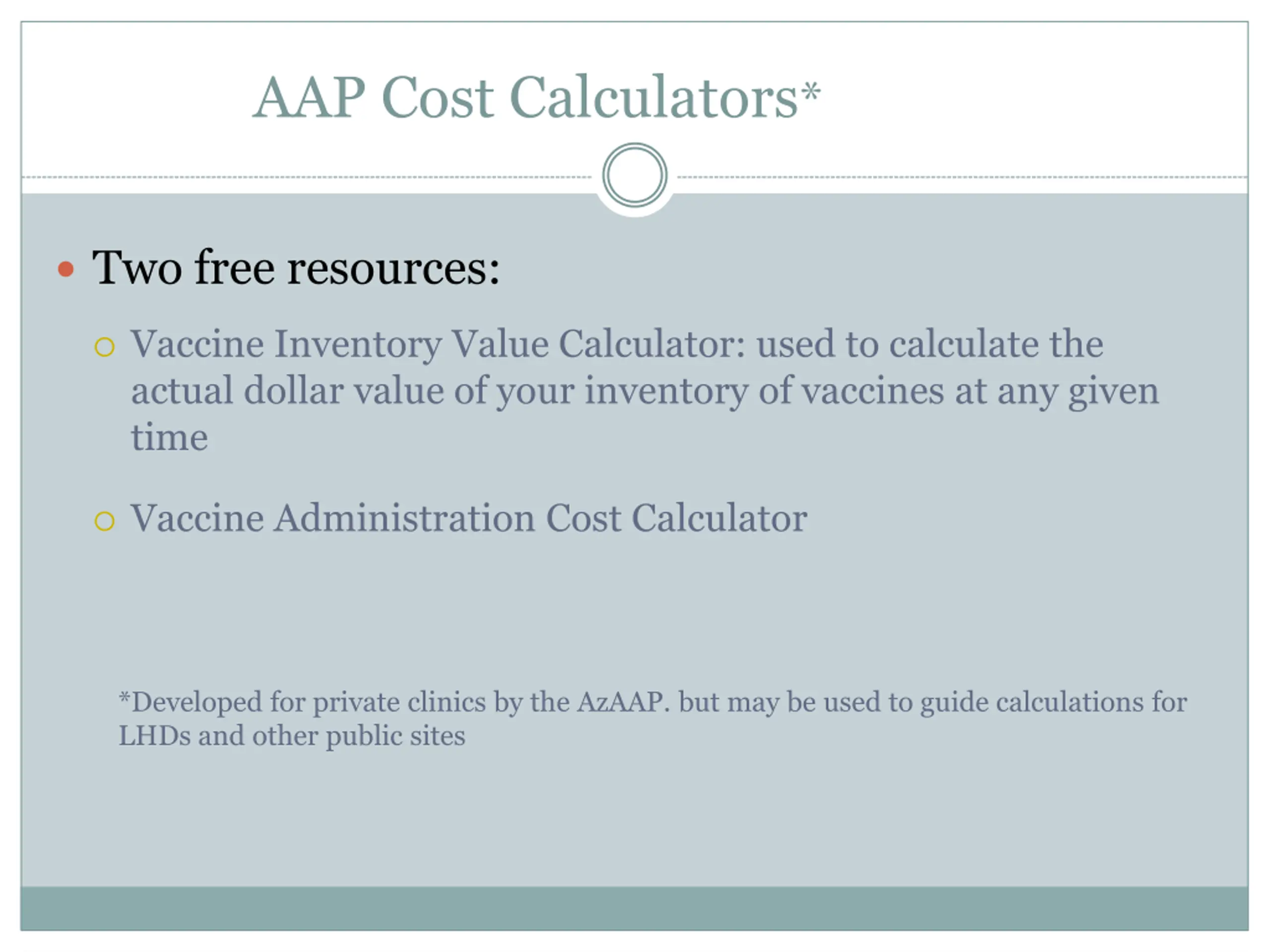 AAP Cost Calculators* Two free resources: Vaccine Inventory Value Calculator: used to calculate the actual dollar value of your inventory of vaccines at any given time Vaccine Administration Cost Calculator *Developed for private clinics by the AzAAP. but may be used to guide calculations for LHDs and other public sites
