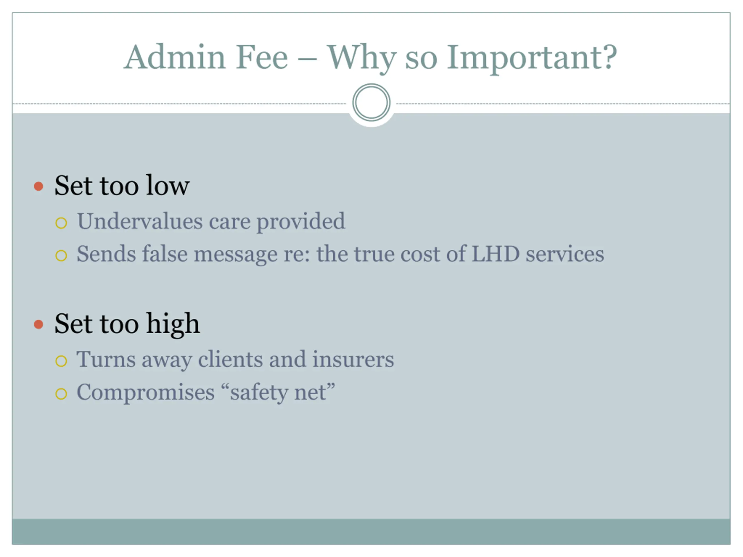 Admin Fee Why so Important? Set too low Undervalues care provided Sends false message re: the true cost of LHD services Set too high Turns away clients and insurers Compromises safety net