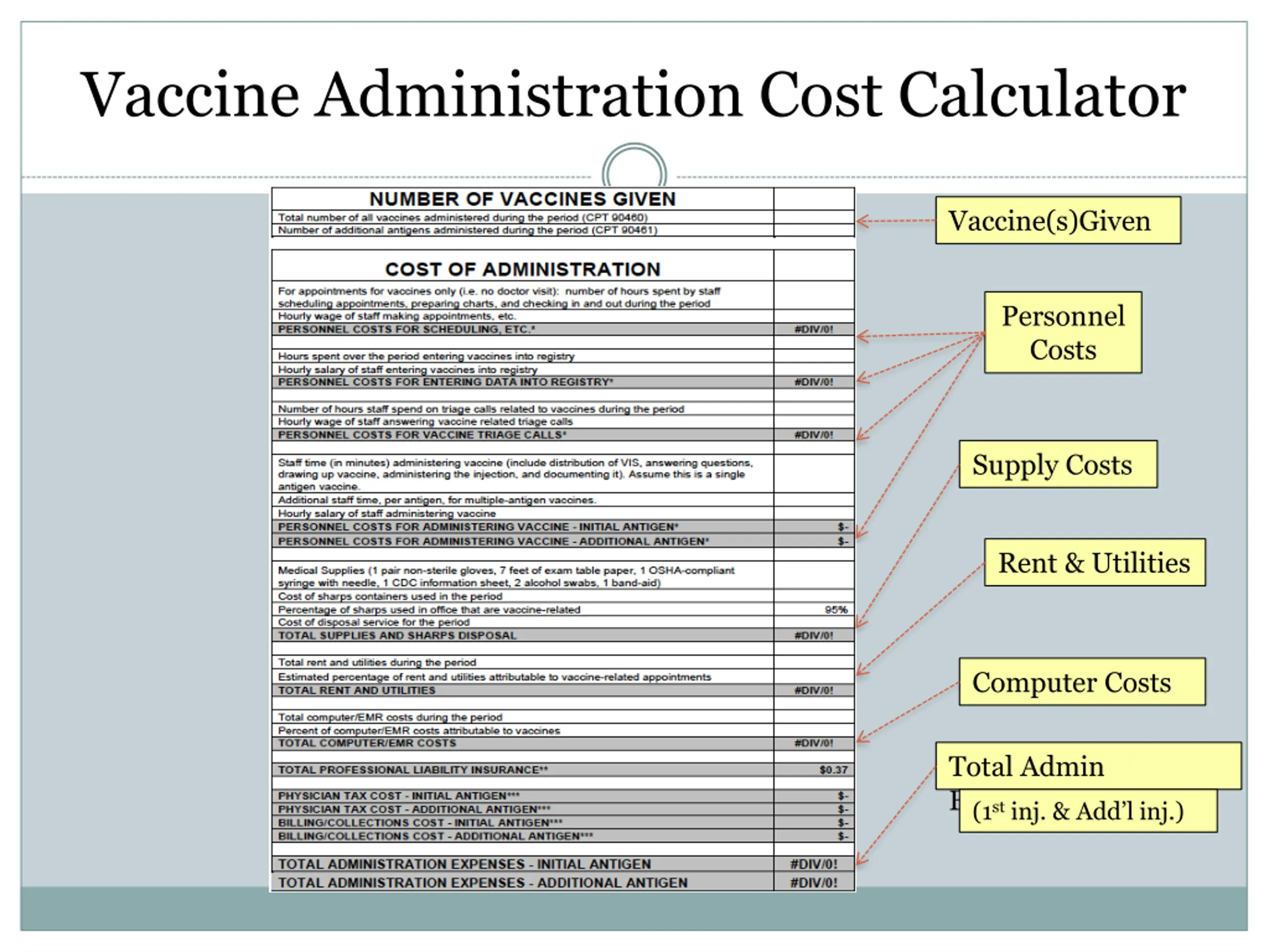 Vaccine Administration Cost Calculator Vaccine(s)Given Personnel Costs Supply Costs Rent & Utilities Computer Costs Total Admin Expenses (1st inj. & Add l inj.)