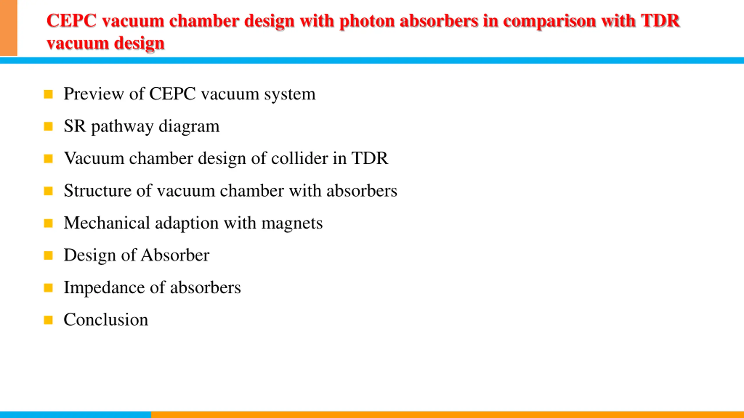 CEPC vacuum chamber design with photon absorbers in comparison with TDR vacuum design Preview of CEPC vacuum system SR pathway diagram Vacuum chamber design of collider in TDR Structure of vacuum chamber with absorbers Mechanical adaption with magnets Design of Absorber Impedance of absorbers Conclusion