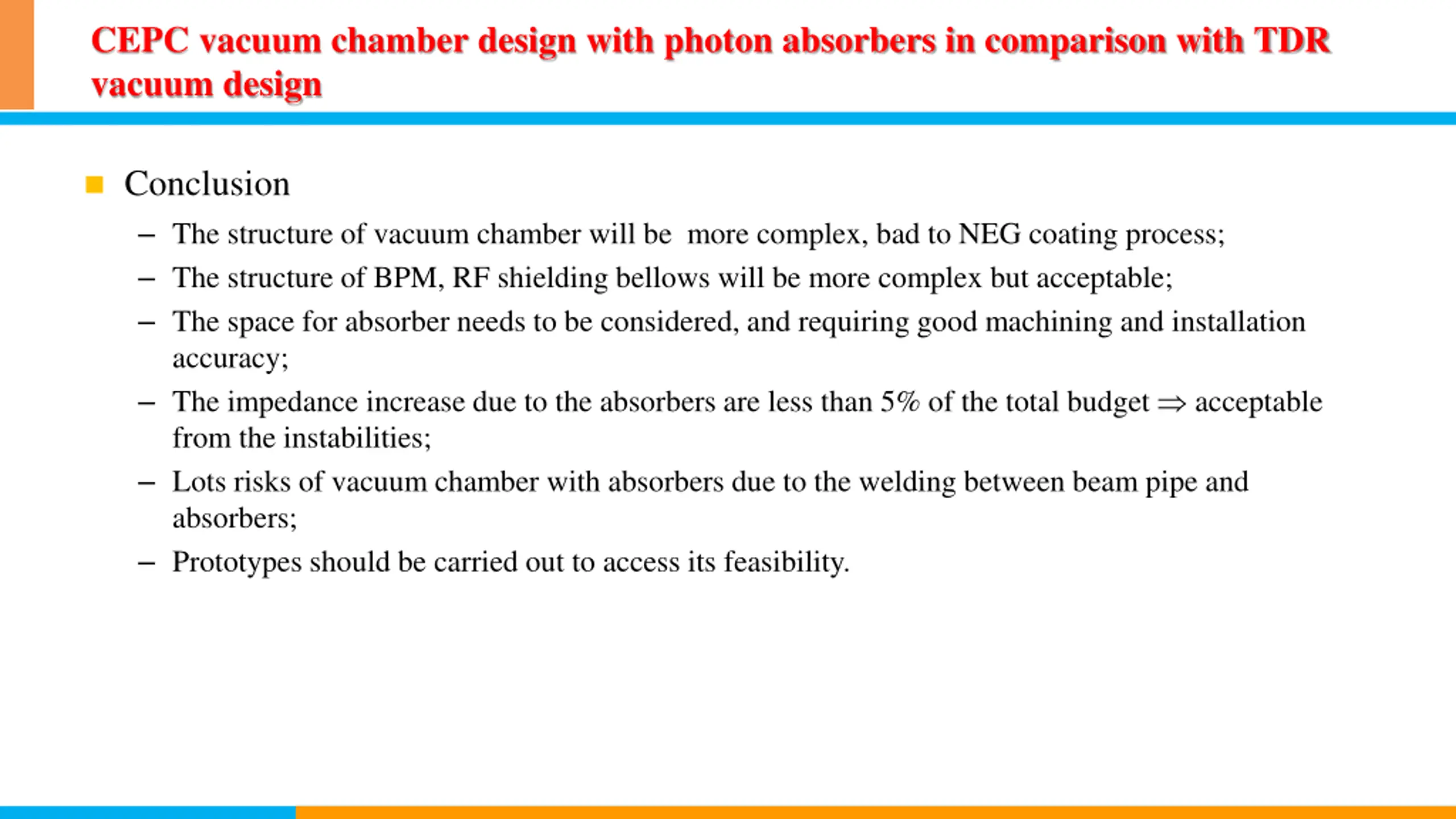 CEPC vacuum chamber design with photon absorbers in comparison with TDR vacuum design Conclusion The structure of vacuum chamber will be more complex, bad to NEG coating process; The structure of BPM, RF shielding bellows will be more complex but acceptable; The space for absorber needs to be considered, and requiring good machining and installation accuracy; The impedance increase due to the absorbers are less than 5% of the total budget acceptable from the instabilities; Lots risks of vacuum chamber with absorbers due to the welding between beam pipe and absorbers; Prototypes should be carried out to access its feasibility.