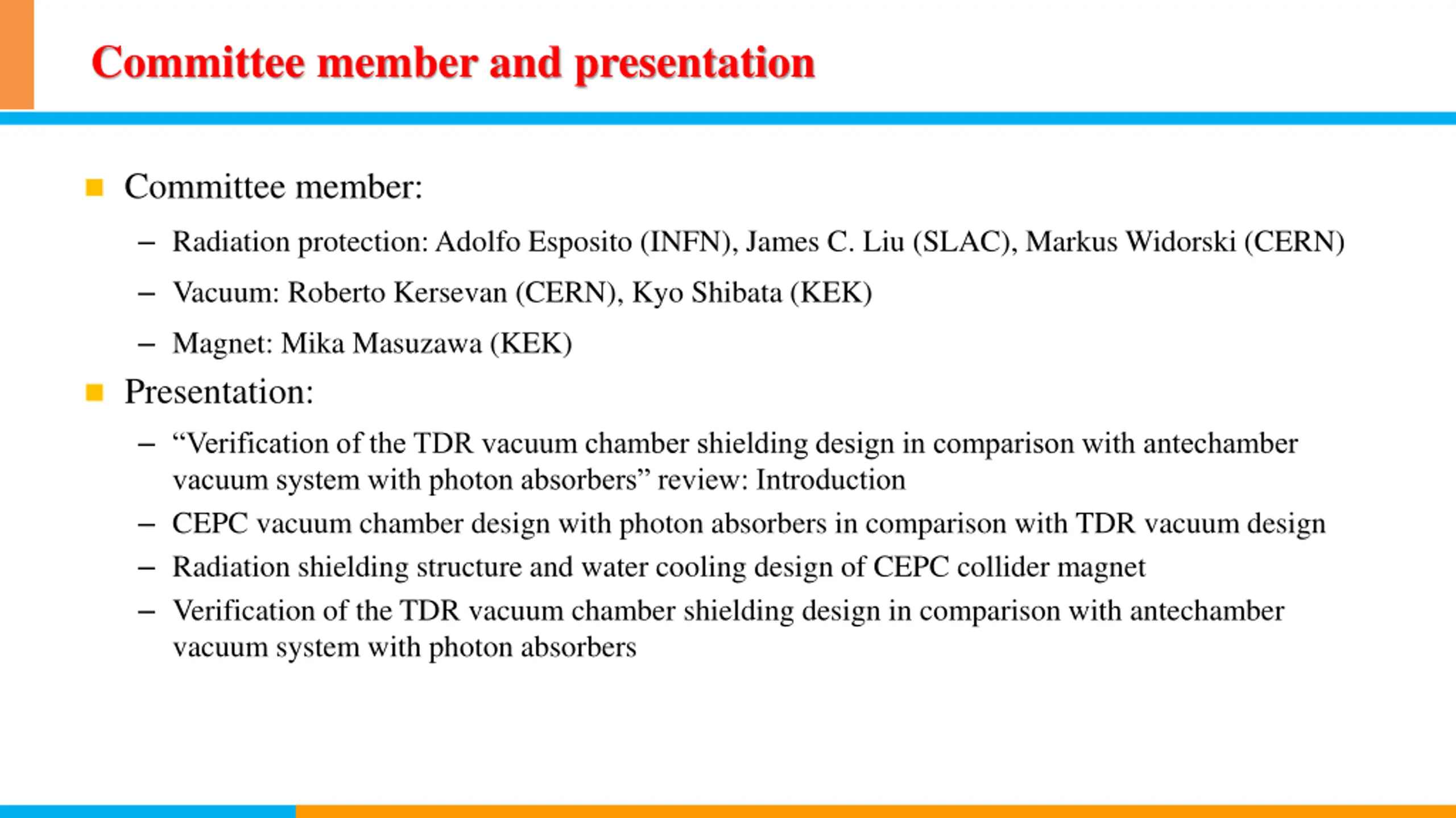 Committee member and presentation Committee member: Radiation protection: Adolfo Esposito (INFN), James C. Liu (SLAC), Markus Widorski (CERN) Vacuum: Roberto Kersevan (CERN), Kyo Shibata (KEK) Magnet: Mika Masuzawa (KEK) Presentation: Verification of the TDR vacuum chamber shielding design in comparison with antechamber vacuum system with photon absorbers review: Introduction CEPC vacuum chamber design with photon absorbers in comparison with TDR vacuum design Radiation shielding structure and water cooling design of CEPC collider magnet Verification of the TDR vacuum chamber shielding design in comparison with antechamber vacuum system with photon absorbers