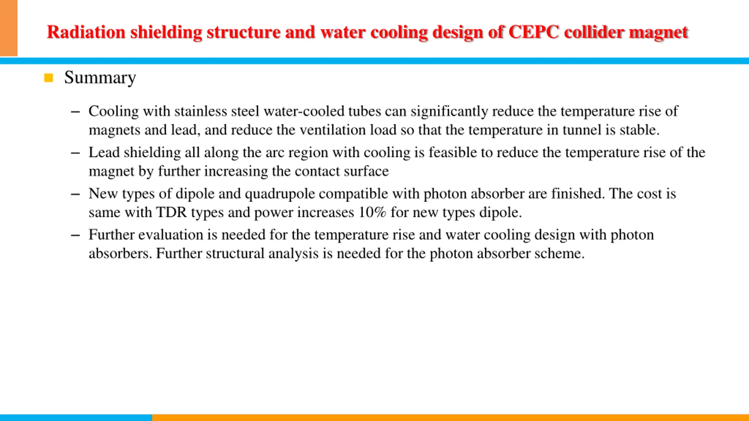 Radiation shielding structure and water cooling design of CEPC collider magnet Summary Cooling with stainless steel water-cooled tubes can significantly reduce the temperature rise of magnets and lead, and reduce the ventilation load so that the temperature in tunnel is stable. Lead shielding all along the arc region with cooling is feasible to reduce the temperature rise of the magnet by further increasing the contact surface New types of dipole and quadrupole compatible with photon absorber are finished. The cost is same with TDR types and power increases 10% for new types dipole. Further evaluation is needed for the temperature rise and water cooling design with photon absorbers. Further structural analysis is needed for the photon absorber scheme.