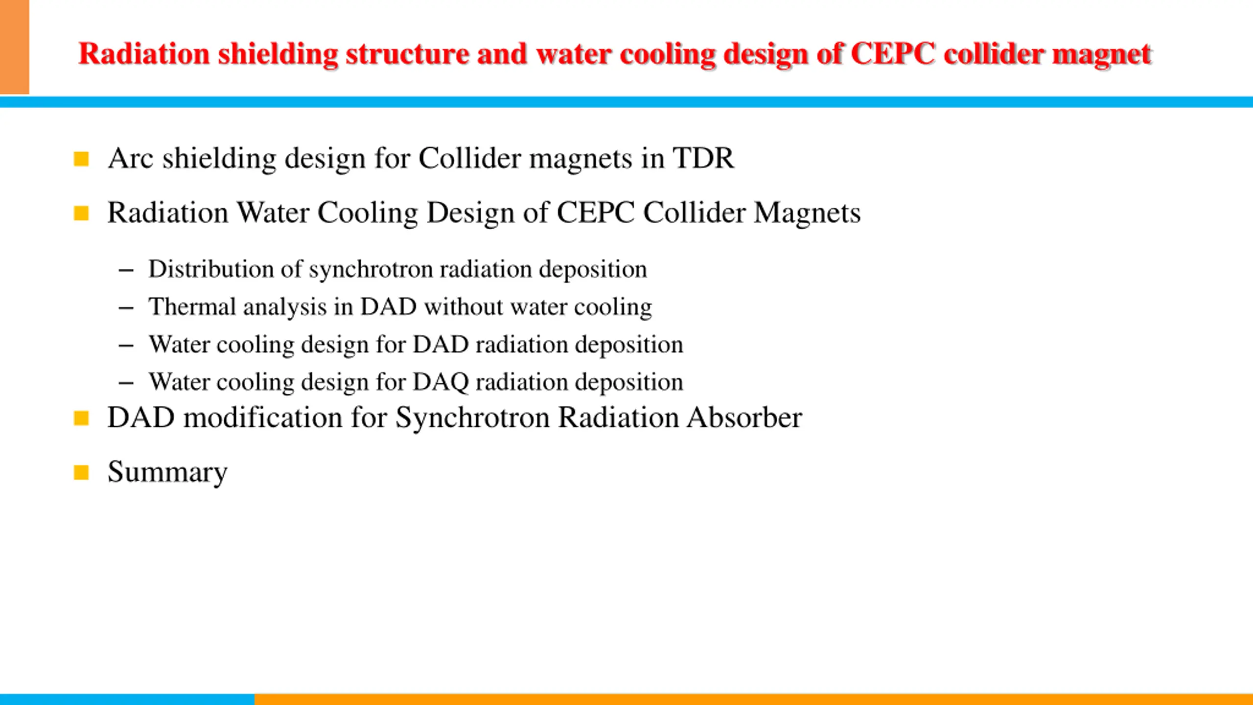 Radiation shielding structure and water cooling design of CEPC collider magnet Arc shielding design for Collider magnets in TDR Radiation Water Cooling Design of CEPC Collider Magnets Distribution of synchrotron radiation deposition Thermal analysis in DAD without water cooling Water cooling design for DAD radiation deposition Water cooling design for DAQ radiation deposition DAD modification for Synchrotron Radiation Absorber Summary