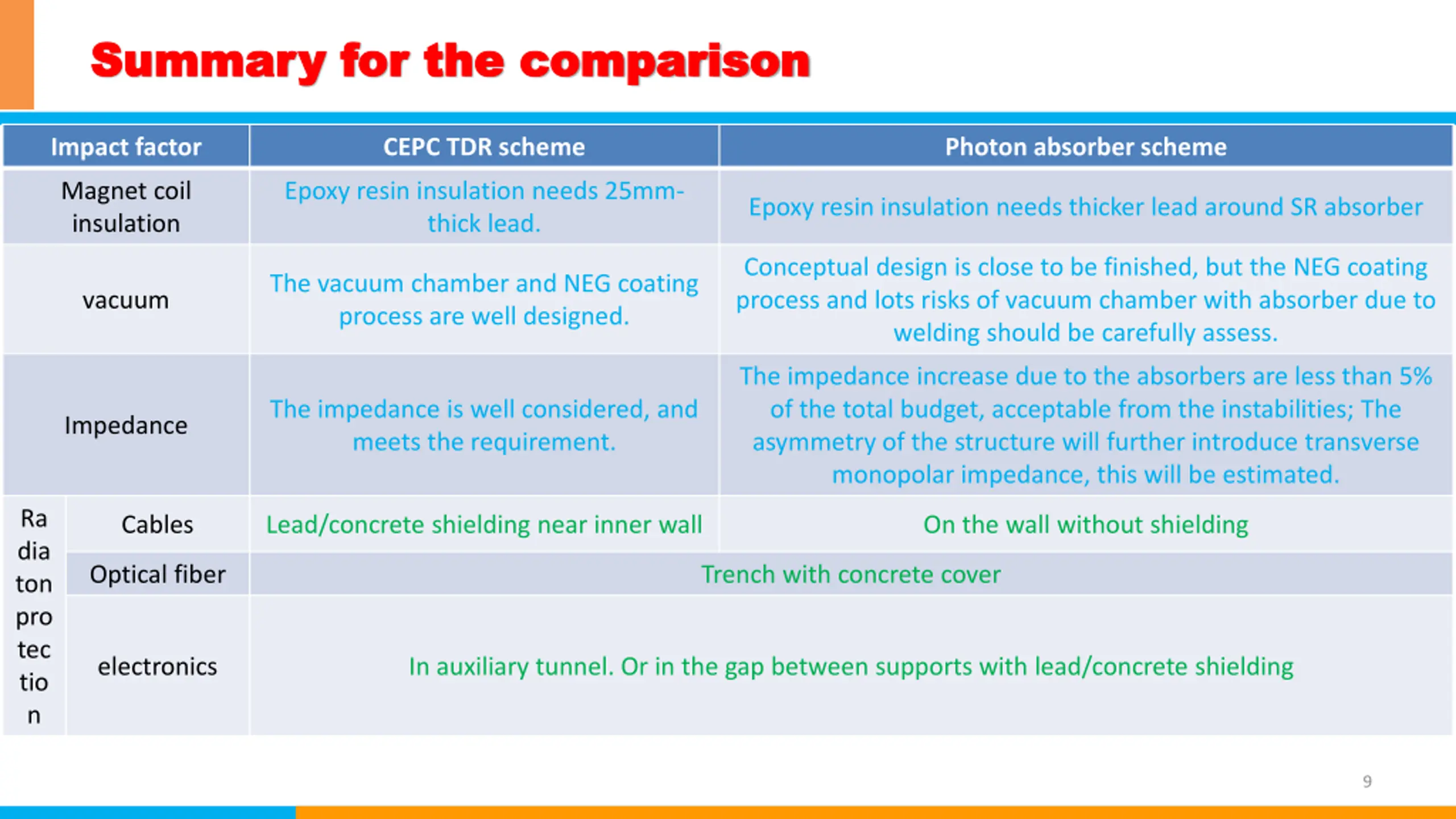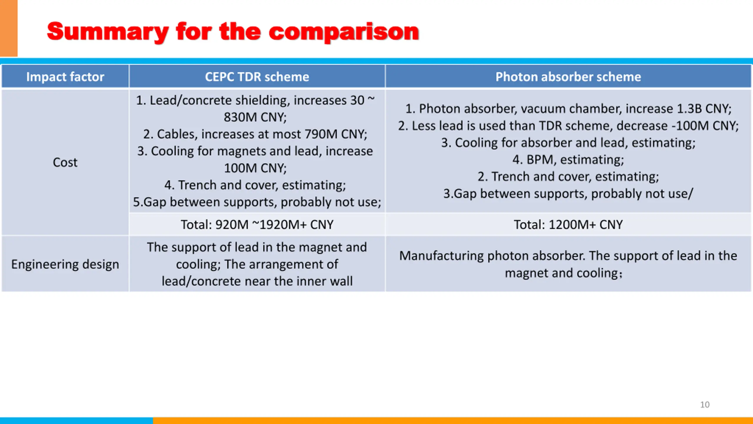 Summary for the comparison Summary for the comparison Impact factor CEPC TDR scheme Photon absorber scheme Magnet coil insulation Epoxy resin insulation needs 25mm- thick lead. Epoxy resin insulation needs thicker lead around SR absorber Conceptual design is close to be finished, but the NEG coating process and lots risks of vacuum chamber with absorber due to welding should be carefully assess. The vacuum chamber and NEG coating process are well designed. vacuum The impedance increase due to the absorbers are less than 5% of the total budget, acceptable from the instabilities; The asymmetry of the structure will further introduce transverse monopolar impedance, this will be estimated. The impedance is well considered, and meets the requirement. Impedance Ra dia ton pro tec tio n Cables Lead/concrete shielding near inner wall On the wall without shielding Optical fiber Trench with concrete cover electronics In auxiliary tunnel. Or in the gap between supports with lead/concrete shielding 9