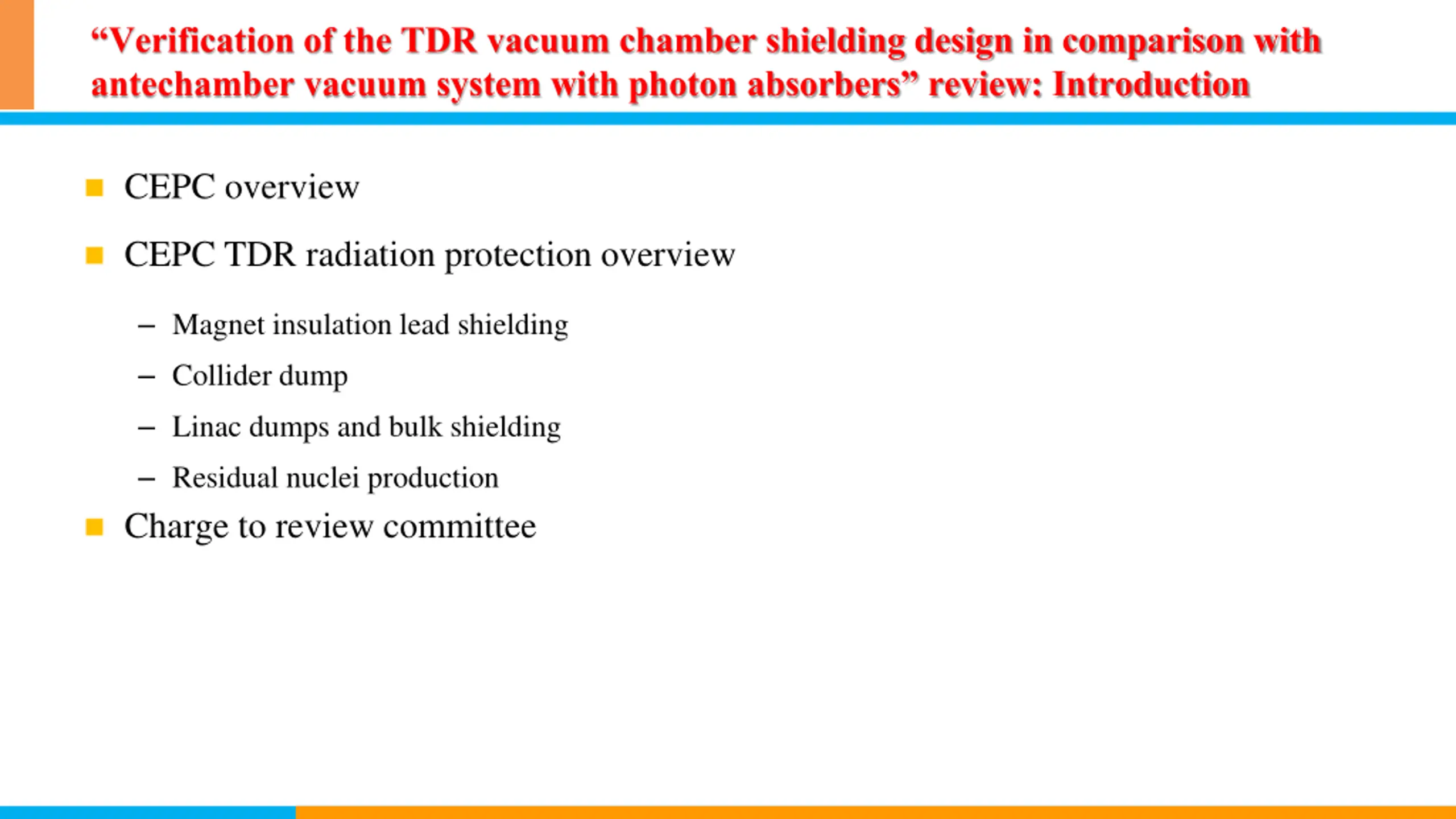 Verification of the TDR vacuum chamber shielding design in comparison with antechamber vacuum system with photon absorbers review: Introduction CEPC overview CEPC TDR radiation protection overview Magnet insulation lead shielding Collider dump Linac dumps and bulk shielding Residual nuclei production Charge to review committee