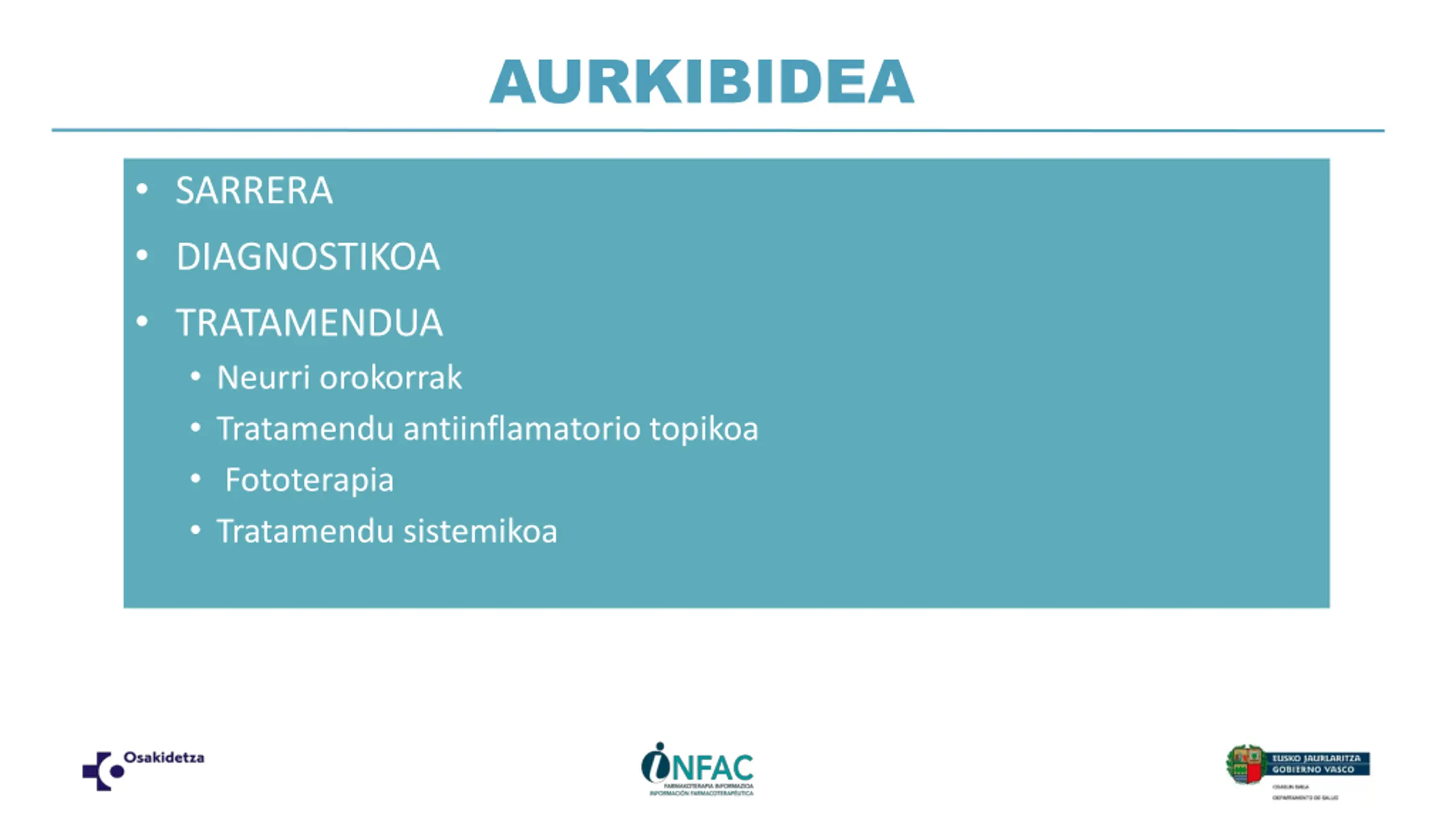 AURKIBIDEA SARRERA DIAGNOSTIKOA TRATAMENDUA Neurri orokorrak Tratamendu antiinflamatorio topikoa Fototerapia Tratamendu sistemikoa